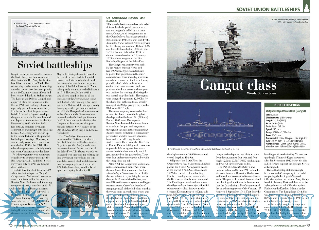 At the start of each section we take a look at the strategic situation for each of the navies represented here: Great Britain, France, USA Soviet Union, Germany, Italy and Japan. Various treaties in the 1920s and '30s had restricted what could be built and so, on the eve of WWII, some navies were still equipped with WWI-era dreadnoughts. These were hastily upgraded as the main threat soon became apparent - thai of attack from the air. After the early war clashes between ships, it was the aircraft earner war in the Pacific that became the focus point, and finally, towards the end, the battleships were lending their awesome weaponry to support landings in France, Italy and the Pacific islands.