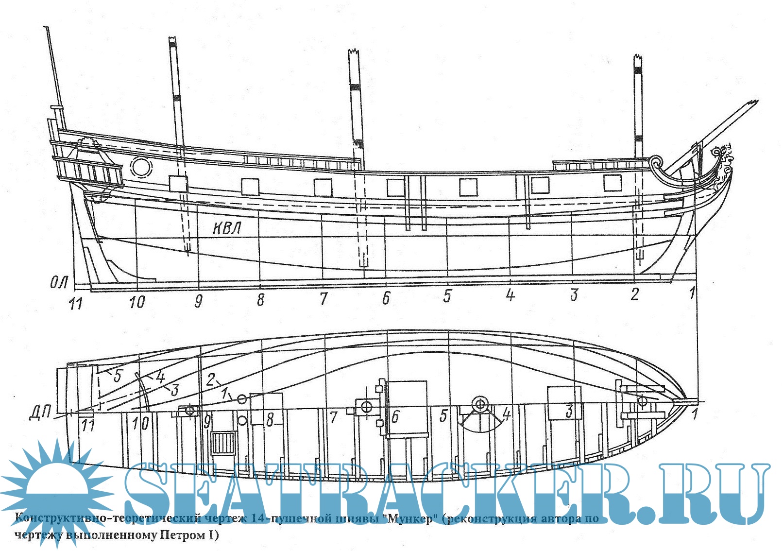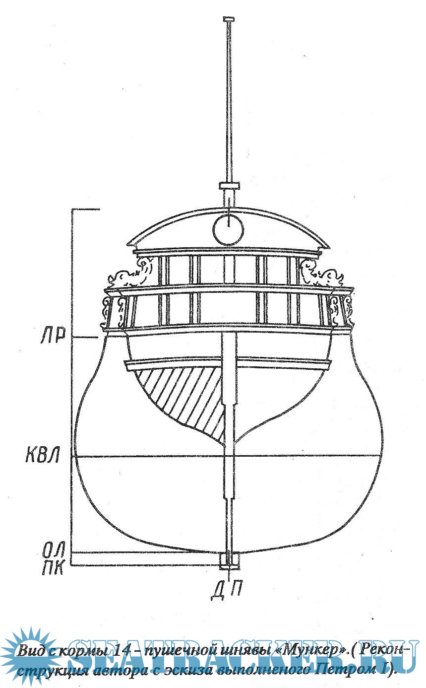 Описание: Чертежи выполненные Петром 1 14-ти пушечной шнявы "Мункер"