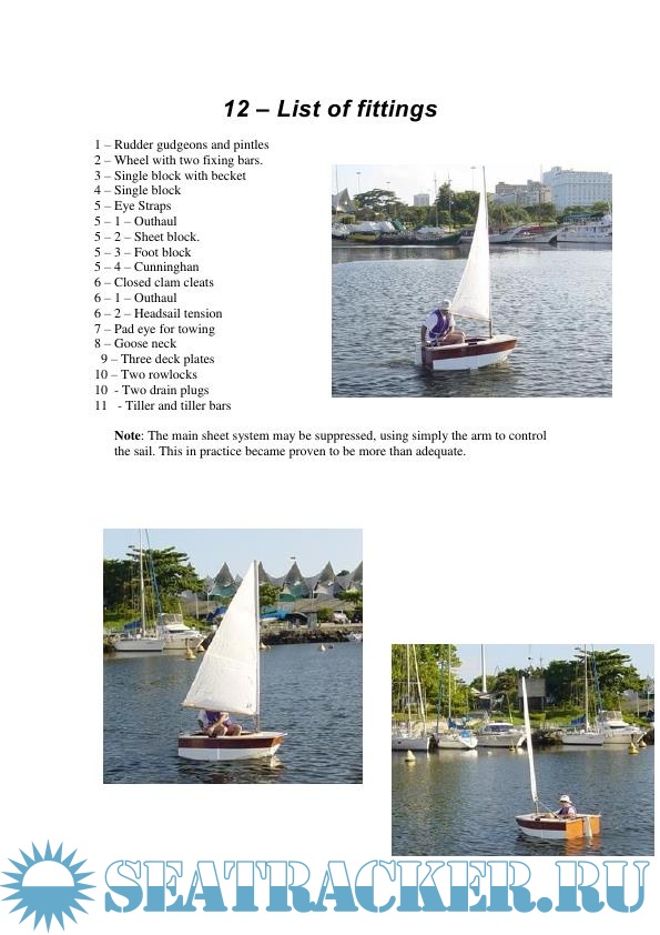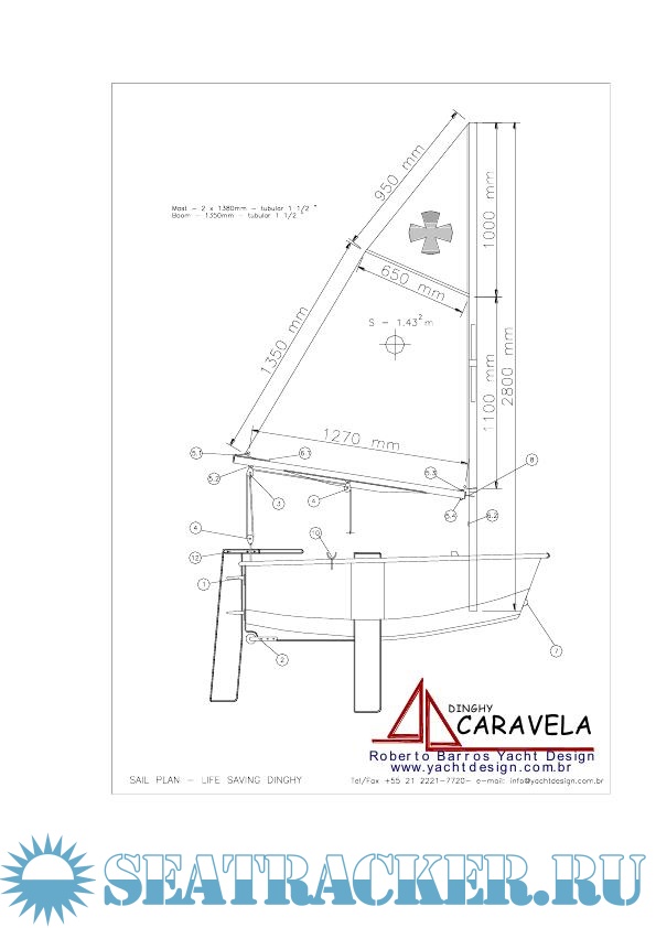 Year: 2016 Language: english Author: Barros R. Genre: Documentation Publisher: Roberto Barros Yacht Design Format: PDF Quality: Scanned pages Pages count: 20 Description: he function as a life-saving vessel is based on the concept that depending on where you are, when a leisure craft is abandoned, there is no absolute assurance of rescue, even if an EPIRB is activated. Being capable of sailing even in bad weather conditions, this dinghy is able to take two persons towards the closest land, provided no beating against the wind is required. The Caravela 1.7 with its shorter sail plan may be considered a life-saving vessel for the following reasons: 1 - The three water-tight compartments have a total volume of 390 litres, which allow up to two persons to be carried with positive flotation, with a reasonable safety margin. 2 - Two of these compartments have inspection ports (deck plates) which allow for dry storage of personal belongings and emergency equipment. 3 - The cover that we recommend to be made to protect the hull when it's lying on deck upside-down, when inverted and with its hem lashed under the rubbing-strake, makes a canopy that provides shade and protects the crew from the elements. 4 - Unobstructed cockpit (yes, this dinghy has a watertight cockpit, even though it is self-draining only when the dinghy is not on service, bliss when it pours heavy rains at night, the water draining by scuppers, not requiring to be bailed by hand on these occasions. You only must remember to shut the scuppers before boarding the dingy) which allows one person to get some rest at a reasonably comfortable position. 5 - A reduced sail plan and a rig that can be installed by one person unassisted, even if the dinghy is drifting away from the mother boat. 6 - The watertight fore-castle allows that one person at a time can climb onboard, with no need of external help. The first person that climbs aboard takes the aft seat to balance the trim for the second one to come aboard. Some equipment may enhance the chances of survival, like portable GPS and VHF, as well as a hand operated desalinator. Even though the dinghy Caravela 1.7 may serve as a life-saving craft, it should not be considered as so in substitution of the country’s mandatory life-saving equipment. There is no restriction in any legislation that you have a complementary means to cope with the emergency of a shipwreck One of the great advantages of building the dinghy Caravela 1.7, if you intend to be involved with a more radical challenge of building your own cruising sailboat, is the opportunity to improve your skills as an amateur builder gathering experience with an easy to build, affordable craft. Main Dimensions Lenght Overall: 1.70 m Maximum beam: 1.24 m Maximum height: 0.48 m Weight (empty): 35 kg Displacement (two persons): 200 kg (aprox.) Reserve buoyancy: 390 litres Sail area (leisure): 2.43 m2 Sail area (unofficial survival craft): 1.43 m2