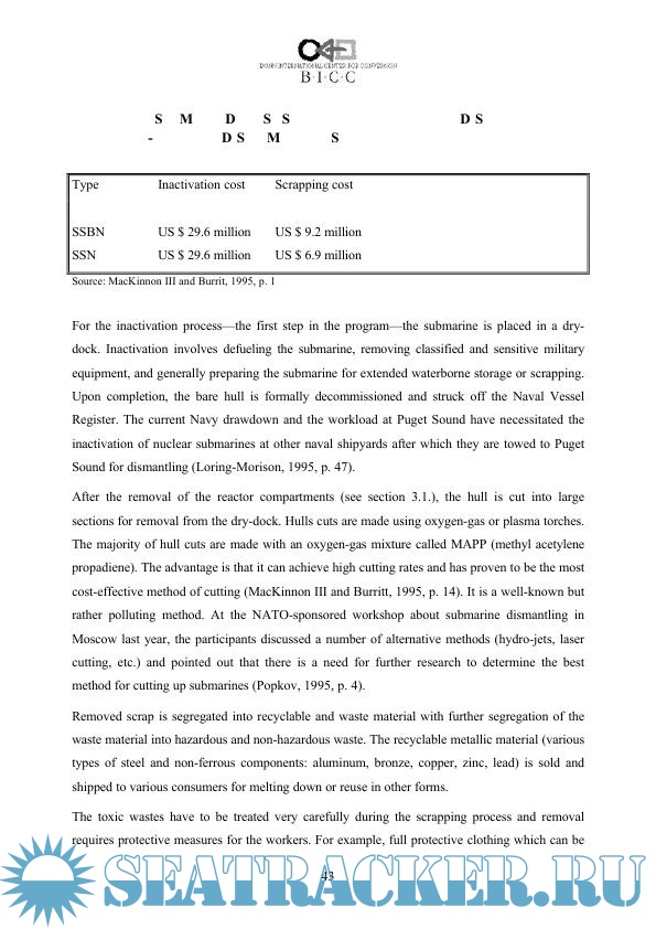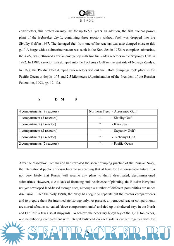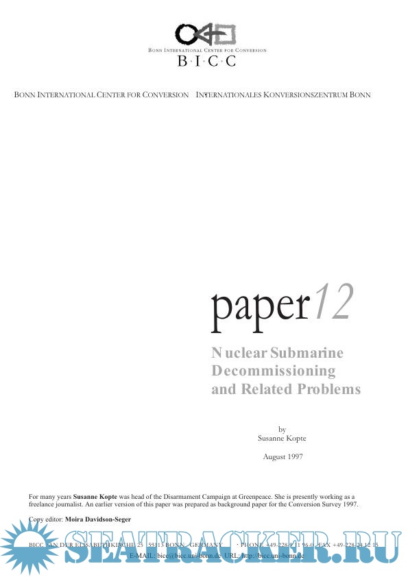 Year: 1997 Language: english Author: Kopte S. Genre: Research papers Publisher: Bonn International Center for Conversion Format: PDF Quality: Scanned pages Pages count: 61 Description: This Paper provides an overview of the status and problems related to nuclear submarine decommissioning worldwide. After a brief description of the history and development of the world nuclear submarine forces, it discusses the main dismantlement and disposal technologies currently used. Here, it mainly concentrates on defueling procedures and the accompanying risks and on various different options for dealing with reactor compartments. Greatest emphasis is given to the nuclear fleet in Russia and the United States.