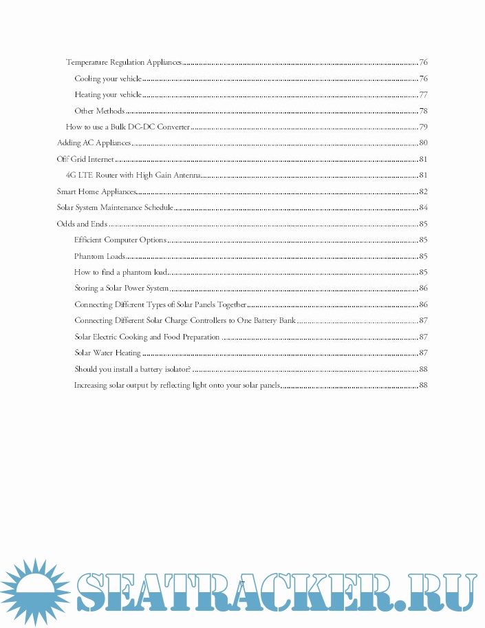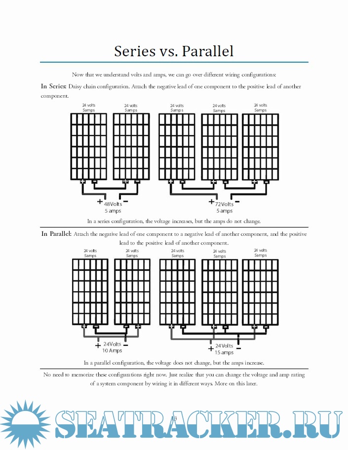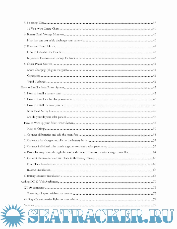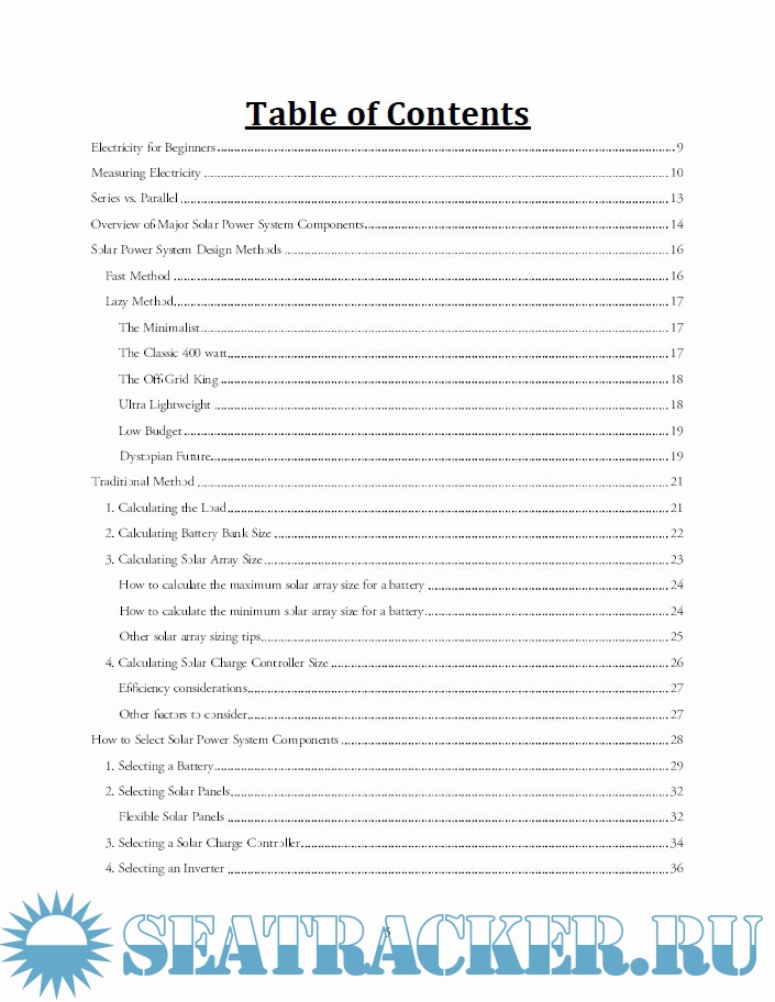 Year: 2018 Language: english Author: William Errol Prowse IV Genre: Guide Edition: 1 ISBN: 978-1546567110 Format: PDF Quality: eBook Pages count: 91 Description: A solar panel will produce electricity, a battery will store electricity and a set of appliances will consume electricity. Electricity travels in wires, or conductors, to transfer energy across distance. 2 wires are required to carry electrical force from one location to another. Electrical energy can be carried in two ways: -Direct Current (DC Power): The flow of electricity is direct and flows like a river. It comes in one wire and flows out the second wire. One wire is positive, one wire is negative. The differentiation of the positive and negative wire is called the polarity and refers to the electrical charge present in the wires which are used to transmit electrical force. -Alternating Current (AC Power): Unlike DC, the electrical force in an AC circuit does not flow, but instead vibrates back and forth to carry energy. Imagine how ocean waves can transmit energy over vast distances, without moving the water. Same concept. There is no positive or negative wire in an AC circuit. Instead, the polarity or electrical charge in the wires is constantly alternating. Alternating current is more efficient than direct current over long distances, but direct current is required if you plan to store the electricity in a battery. Appliances can be designed to use DC or AC power. Some motors and lights can be powered with AC power, but most AC appliances transform the AC electricity into DC electricity, mwhich is much more versatile. AC electricity is great for sending electrical energy over long distances, and DC electricity is versatile and easy to put to work. In a solar power system: -Solar panels produce DC electricity that travels through 2 wires and is stored in a battery. -DC powered appliances are then connected to the battery with 2 wires so that they will consume the stored electricity in the battery and put it to work. -If you plan to power AC appliances with a DC battery, you will need to transform DC electricity into AC electricity with a device called an inverter. More on this in a bit.