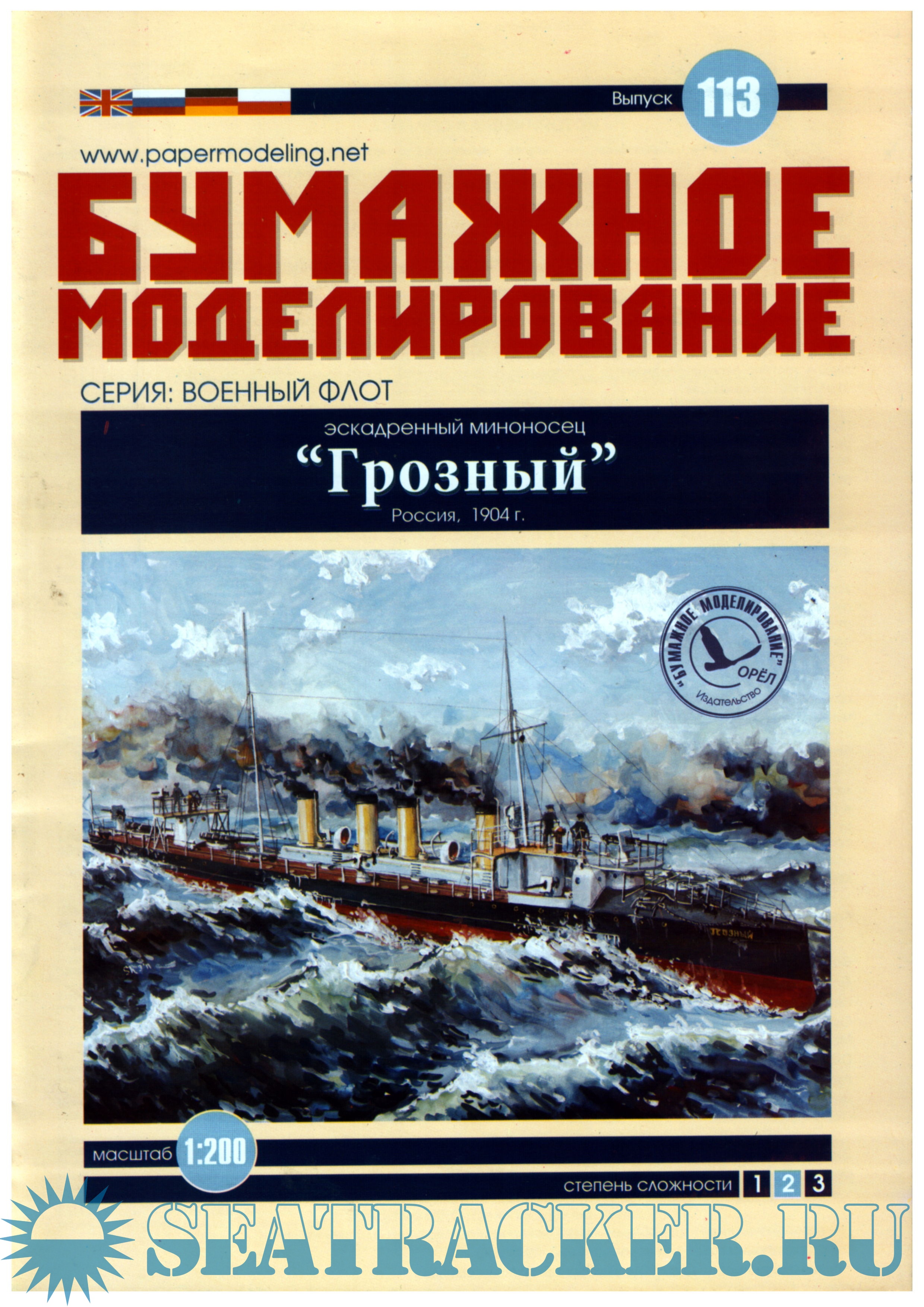 11 листов цветных выкроек и инструкций для изготовления бумажной модели эсминца Грозный 1904 год в масштабе 1:200