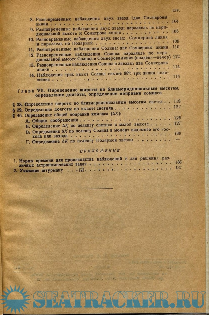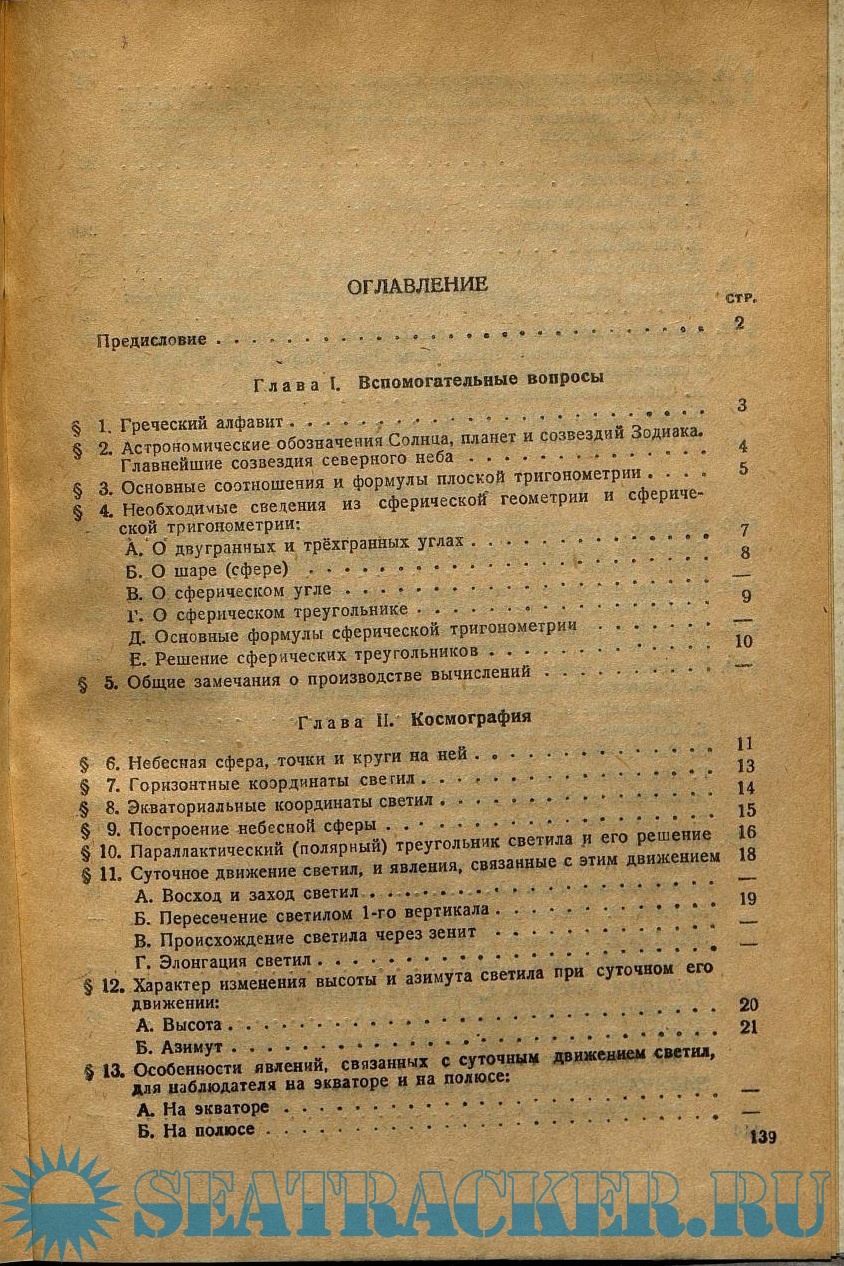Год выпуска: 1946 Язык: русский Автор: Хлюстин Б.П. Жанр: Учебное пособие Издательство: Морской транспорт Формат: PDF Качество: Отсканированные страницы Количество страниц: 154 Описание: Греческий алфавит. Астрономические обозначения Солнца, планет и созвездий Зодиака. Главнейшие созвездия северного неба. Основные соотношения и формулы плоской тригонометрии. Необходимые сведения из сферической геометрии и сферической тригонометрии. Общие замечания о производстве вычислений. Небесная сфера, точки и круги на ней. Горизонтальные координаты светил. Экваториальные координаты светил. Построение небесной сферы. Параллактический (полярный) треугольник светила и его решение. Суточное движение светил, и явления, связанные с этим движением. Характер изменения высоты и азимута светила при суточном его движении. Особенности явлений, связанных с суточным движением светил, для наблюдателя на экваторе и на полюсе. Собственное годовое движение Солнца. Особенности явлений, связанных с собственным движением Солнца, при одновременном суточном вращении сферы, для наблюдателей в разных широтах. Эклиптические координаты светил. Понятие о прецессии. Характер изменения долготы Солнца. Продолжительность времён года. Характер изменения прямого восхождения и склонения Солнца. Собственное движение Луны. Фазы Луны. Возраст Луны. Понятие о солнечных и лунных затмениях. Звёздные сутки. Звёздное время, основная формула времени. Солнечные (истинные) сутки. Средние сутки. Среднее Солнце, среднее время. Годы. Времена и часовые углы на разных меридианах. Поясное время. Судовое время. Декретное время. Демаркационная линия времени. Морской Астрономический Ежегодник. Общие положения, касающиеся выборки из Ежегодника различных величин. Хронометр и часы. Различные задачи на время. Устройство звёздного глобуса и работа с ним. Секстан. Измерение секстаном углов и высот. Исправление высот. Число наблюдений и приёмы их обработки. Приведение высот к одному зениту. Наивыгоднейшие условия наблюдения светил для решения основных задач мореходной астрономии. Метод линий положения. Линия Сомнера и метод Сент-Илера проложения её на меркаторскую карту. Определение места корабля как точки пересечения двух или трех линий положения. Прокладка на бумаге. Особый случай определения места корабля в случае наблюдения больших (свыше 88 градусов) высот Солнца. Определение широты по близмеридиональным высотам светил. Определение долготы по высоте светила. Определение общей поправки компаса. Нормы времени для производства наблюдений и для решения различных астрономических задач. Указания штурману.
