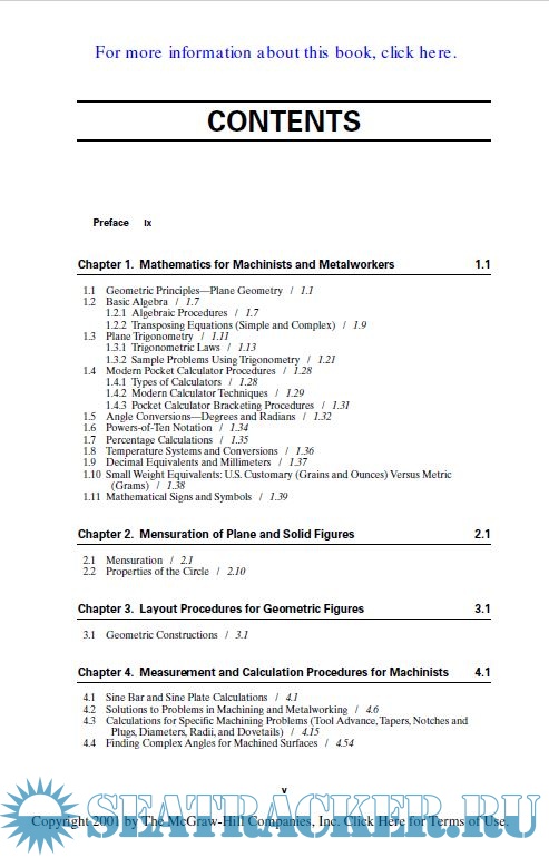 Year: 2001 Language: english Author: Ronald A. Walsh Genre: Handbook Publisher: McGraw-Hill Format: PDF Quality: Scanned pages + text layer Pages count: 379 Description: This handbook contains most of the basic and advanced calculation procedures required for machining and metalworking applications. These calculation procedures should be performed on a modern pocket calculator in order to save time and reduce or eliminate errors while improving accuracy. This book is written in a user-friendly format, so that the mathematical equations and examples shown for solutions to machining and metalworking problems are not only highly useful and relatively easy to use, but are also practical and efficient. This book covers metalworking mathematics problems, from the simple to the highly complex, in a manner that should be valuable to all readers. It should be understood that these mathematical procedures are applicable for: Master machinists Machinists Tool designers and toolmakers Metalworkers in various fields Mechanical designers Tool engineering personnel CNC machining programmers The gunsmithing trade Students in technical teaching facilities