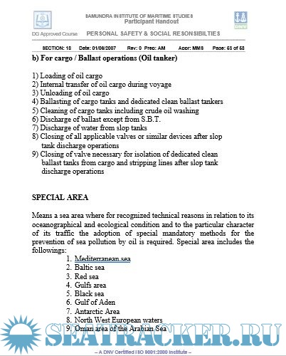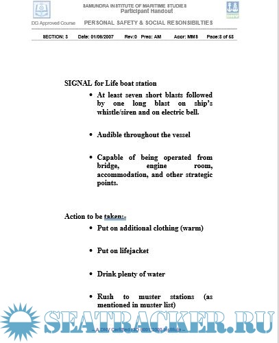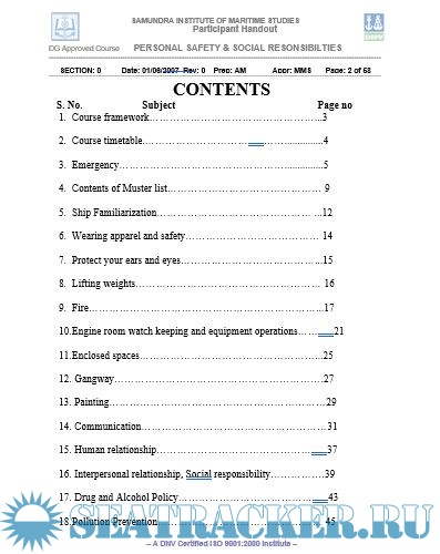 Year: 2007 Language: english Author: SIMS Genre: Training courses Publisher: Samundra Institute of Maritime Studies Format: DOC Quality: eBook Pages count: 58 Description: This course, called the Personal Safety and Social Responsibility, aims to provide familiarization, basic safety training and instruction for safe working procedures and social responsibility aboard ship. It is based on the guidance on training in section A-VI/ 1 of the STCW 1978 as amended in 1995 (STCW 1995) Section A-VI/1-4. Appendix M-VI/1D of Meta Manual Vol.II and IMO Model course 1.21 have been used in preparation of material for this course. A trainee successfully completing this course will be able to: a) Identify potential areas of emergencies and comply with emergency procedures. b) Take precautions to prevent pollution of the marine environment c) Observe safe working practices to eliminate personal accidents and injuries. d) Understand orders and be understood in relation to shipboard duties e) Contribute to effective humane/social relationship on board ship. Additional info: 3 days course.