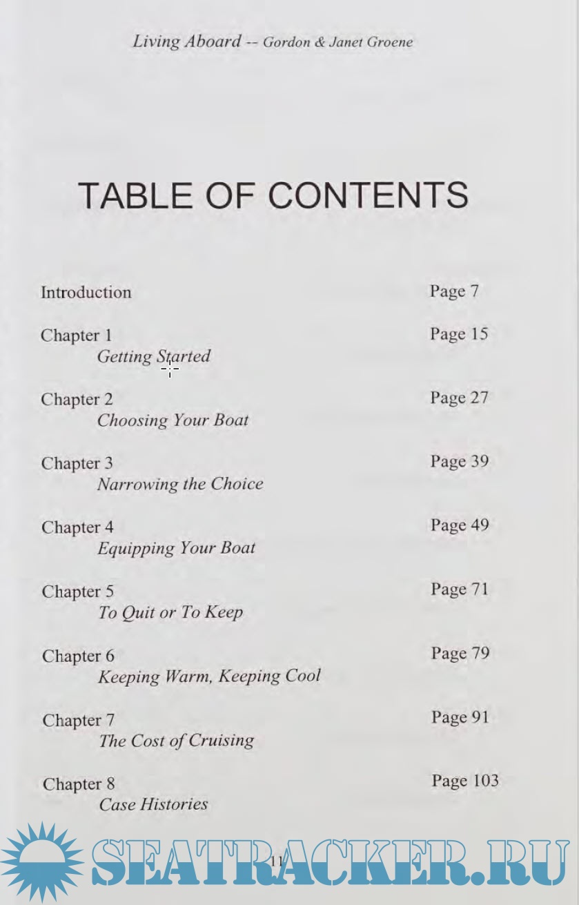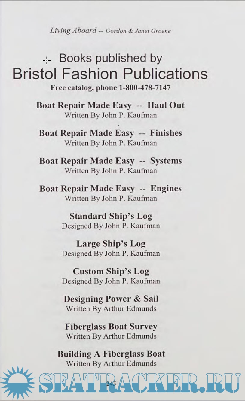 Year: 2000 Language: English Author: Gordon & Janet Groene Genre: Handbook Publisher: Bristol Fashion Publications, Inc. Edition: First ISBN: 978-1892216274 Format: PDF Quality: Scanned pages Pages count: 246 Description: Living Aboard is not another "How we did it," book derived from the experiences of one couple or family. It is not about sailing around the world or to selected far off destinations. It is about living aboard a boat, whether in a slip, on the hook, or at sea. Granted, Janet and Gordon lived aboard for many years and in doing so learned the liveaboard lifestyle the hard way. They not only draw on their days as liveaboards but relate other cruisers' lives as well. By relating knowledge from a varied and diverse group of liveaboards, the Groene's have made this book a true insight into the lifestyle. A lifestyle that is wonderful for some and a nightmare for others. The time to learn if this lifestyle is right for you is now, before you move aboard. After reading this book you will know if the liveaboard lifestyle is right for you. Living Aboard explains what to expect from the lifestyle. Janet's companion book, Creating Comfort Afloat, (Bristol Fashion Publications) explains how to make a boat your home. The Groene's have written hundreds of articles on the liveaboard lifestyle. Now you can have all that knowledge in this one volume, the Groene's nineteenth book, Living Aboard. Illustrated