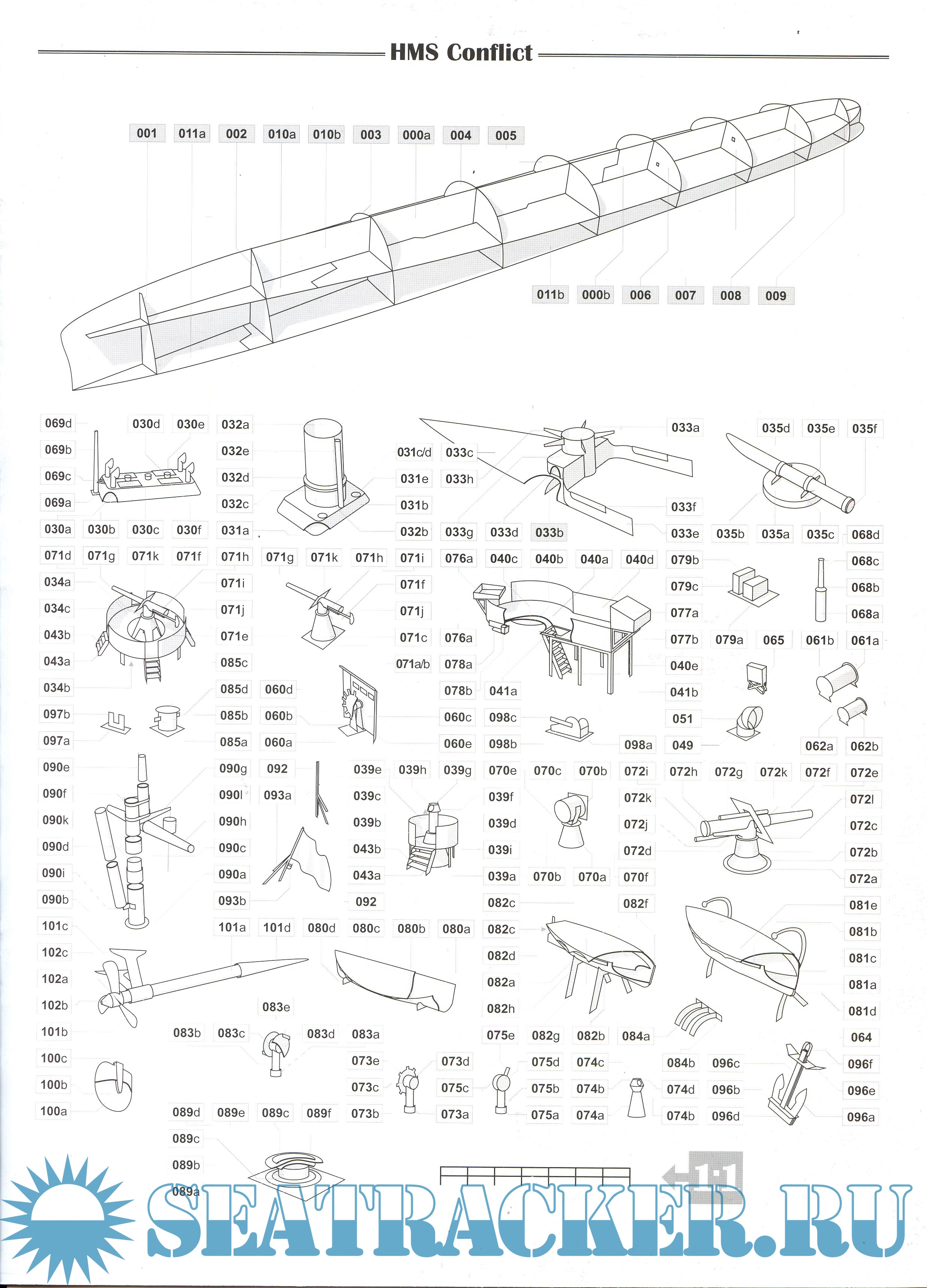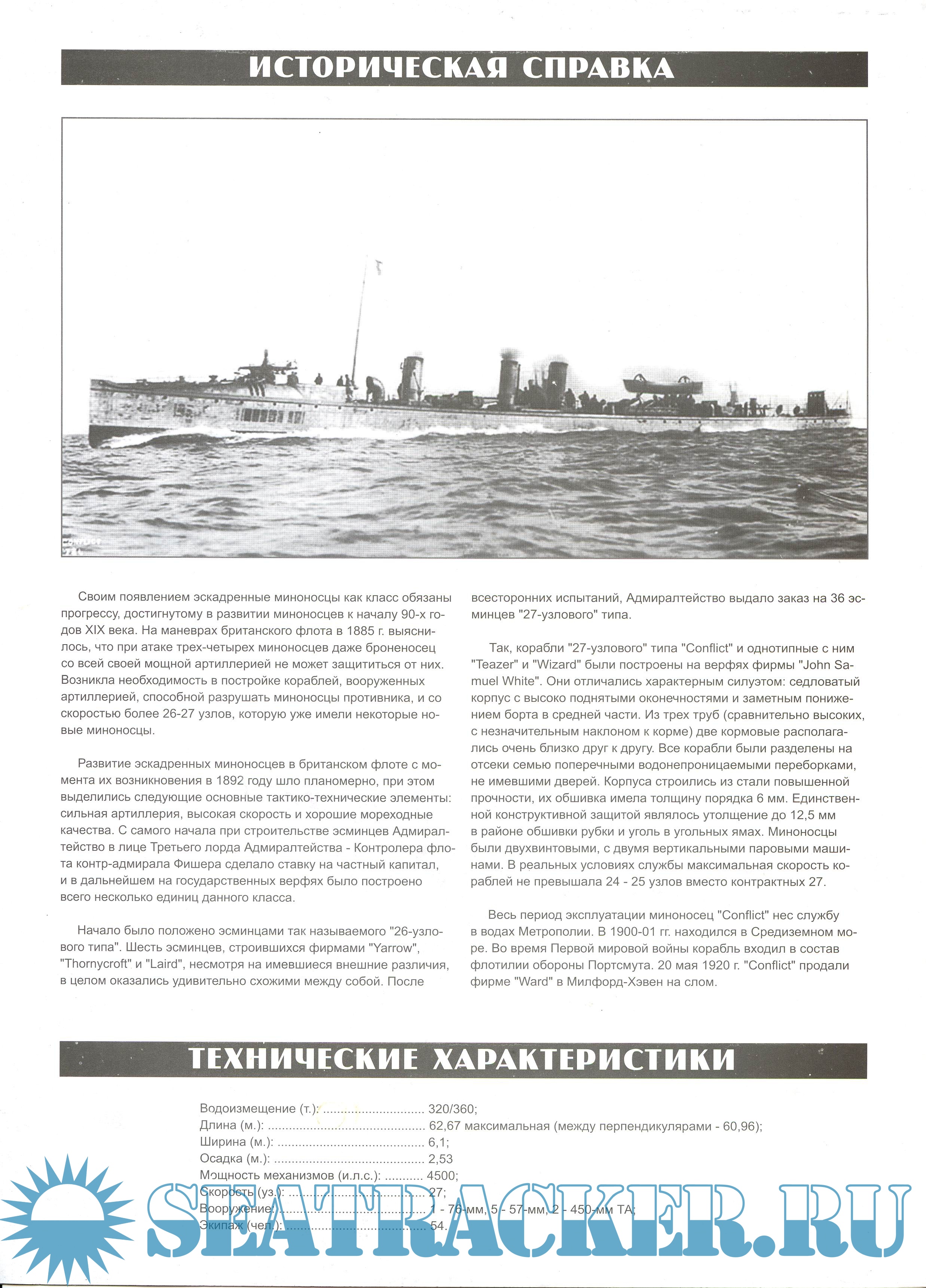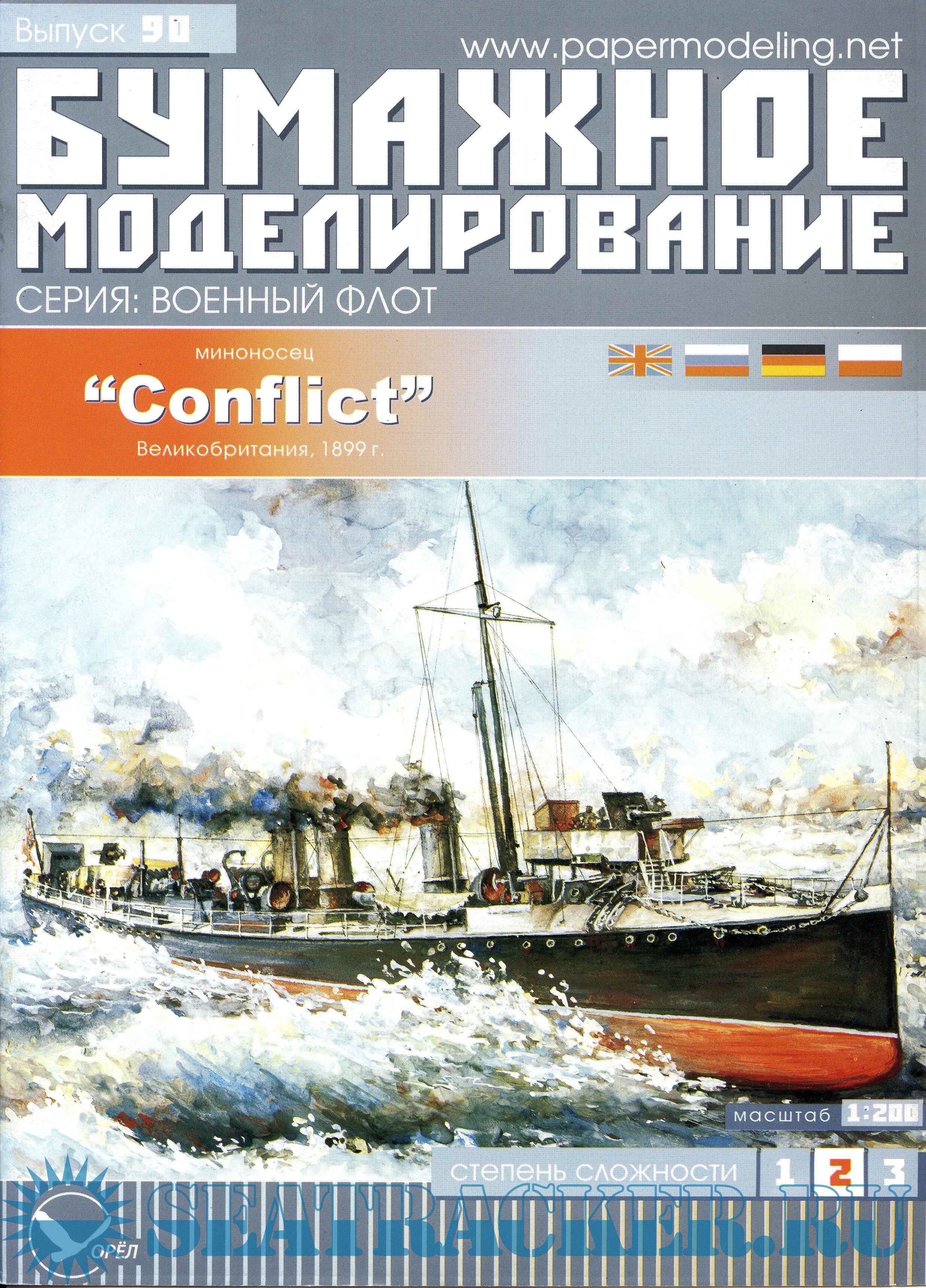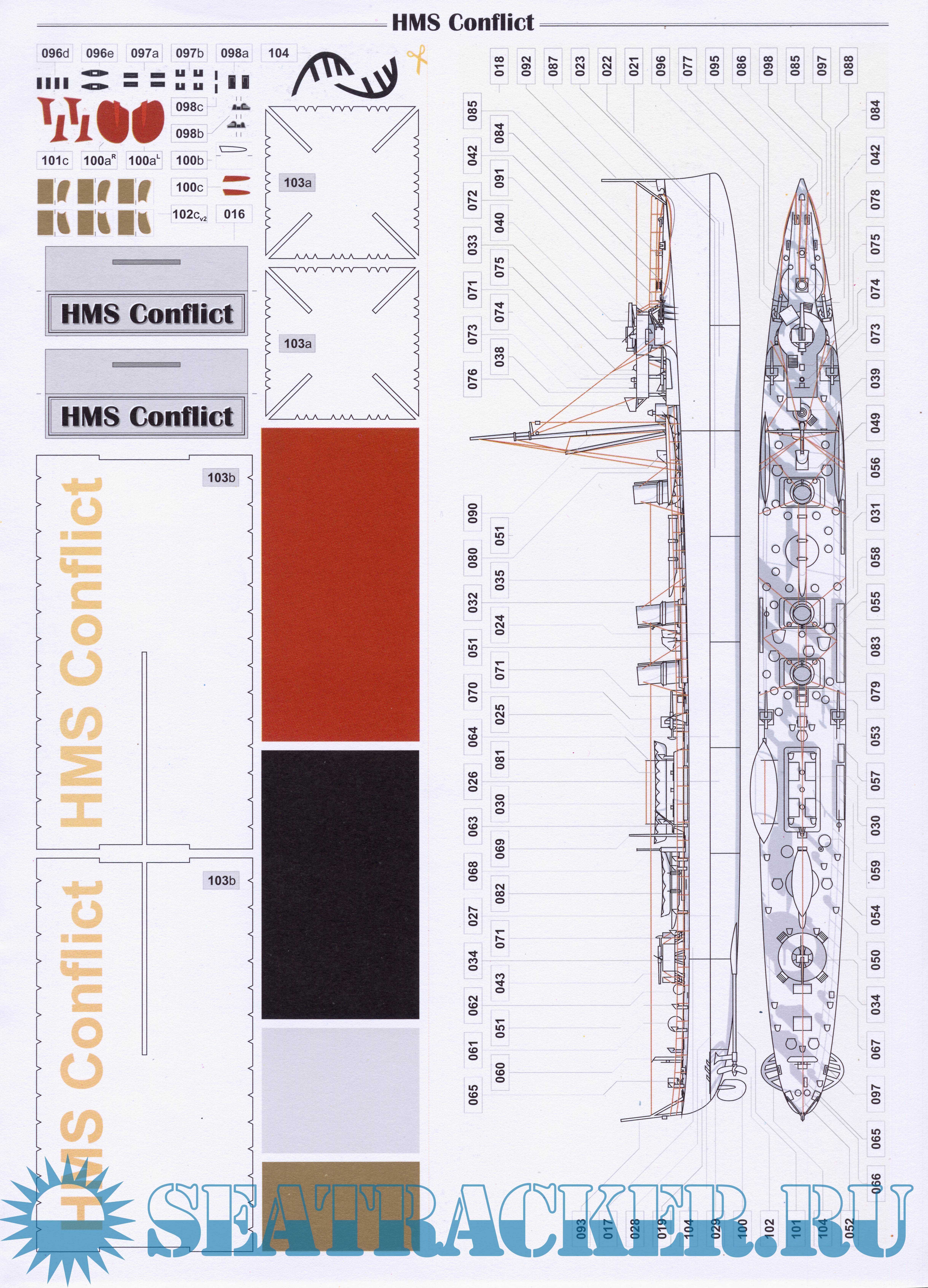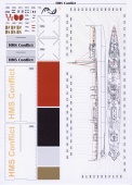 Описание: 16 листов цветных выкроек и инструкций по изготовлению бумажной модели миноносца Conflict Великобритания 1899 год в масштабе 1:200