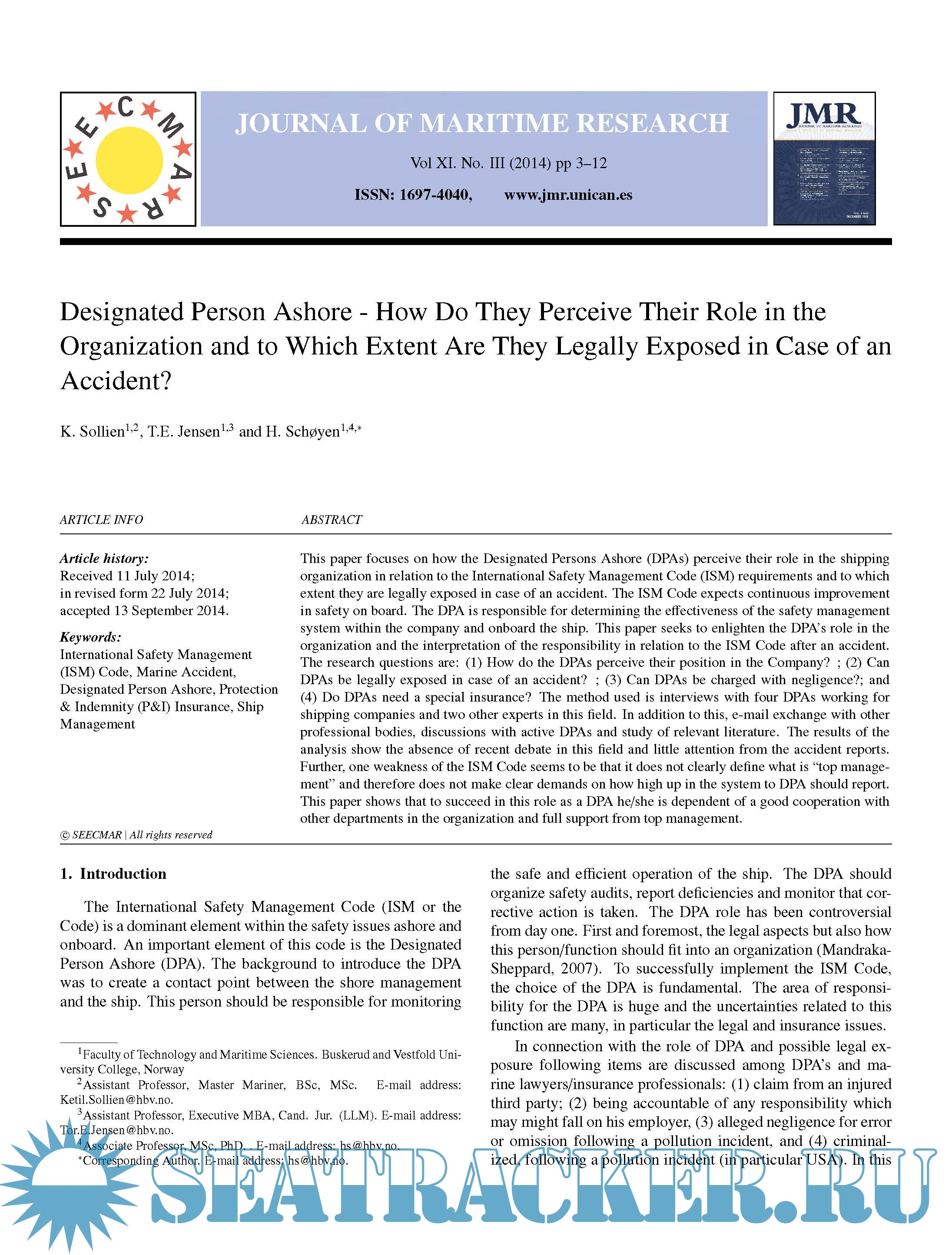 Year: 2014 Language: english Author: JOURNAL OF MARITIME RESEARCH Genre: Practical guide Format: PDF Quality: OCR with errors Pages count: 10 Description: This paper focuses on how the Designated Persons Ashore (DPAs) perceive their role in the shipping organization in relation to the International Safety Management Code (ISM) requirements and to which extent they are legally exposed in case of an accident. The ISM Code expects continuous improvement in safety on board. The DPA is responsible for determining the eectiveness of the safety management system within the company and onboard the ship. This paper seeks to enlighten the DPA’s role in the organization and the interpretation of the responsibility in relation to the ISM Code after an accident. The research questions are: (1) How do the DPAs perceive their position in the Company? ; (2) Can DPAs be legally exposed in case of an accident? ; (3) Can DPAs be charged with negligence?; and (4) Do DPAs need a special insurance? The method used is interviews with four DPAs working for shipping companies and two other experts in this field. In addition to this, e-mail exchange with other professional bodies, discussions with active DPAs and study of relevant literature. The results of the analysis show the absence of recent debate in this field and little attention from the accident reports. Further, one weakness of the ISM Code seems to be that it does not clearly define what is “top management” and therefore does not make clear demands on how high up in the system to DPA should report. This paper shows that to succeed in this role as a DPA he/she is dependent of a good cooperation with other departments in the organization and full support from top management.