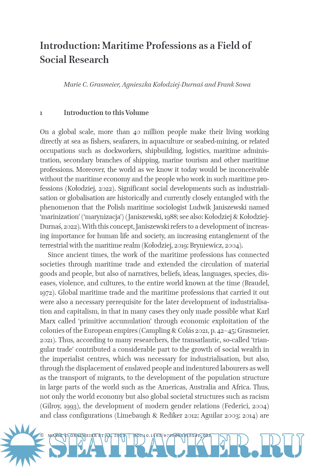 On a global scale, more than 40 million people make their living working directly at sea as fishers, seafarers, in aquaculture or seabed-mining, or related occupations such as dockworkers, shipbuilding, logistics, maritime administration, secondary branches of shipping, marine tourism and other maritime professions. Moreover, the world as we know it today would be inconceivable without the maritime economy and the people who work in such maritime professions (Kołodziej, 2022). Significant social developments such as industrialisation or globalisation are historically and currently closely entangled with the phenomenon that the Polish maritime sociologist Ludwik Janiszewski named ‘marinization’ (‘marynizacja’) (Janiszewski, 1988; see also: Kołodziej & Kołodziej- Durnaś, 2022). With this concept, Janiszewski refers to a development of increasing importance for human life and society, an increasing entanglement of the terrestrial with the maritime realm (Kołodziej, 2019; Bryniewicz, 2004). Since ancient times, the work of the maritime professions has connected societies through maritime trade and extended the circulation of material goods and people, but also of narratives, beliefs, ideas, languages, species, diseases, violence, and cultures, to the entire world known at the time (Braudel, 1972). Global maritime trade and the maritime professions that carried it out were also a necessary prerequisite for the later development of industrialisation and capitalism, in that in many cases they only made possible what Karl Marx called ‘primitive accumulation’ through economic exploitation of the colonies of the European empires (Campling & Colás 2021, p. 42–45; Grasmeier, 2021). Thus, according to many researchers, the transatlantic, so-called ‘triangular trade’ contributed a considerable part to the growth of social wealth in the imperialist centres, which was necessary for industrialisation, but also, through the displacement of enslaved people and indentured labourers as well as the transport of migrants, to the development of the population structure in large parts of the world such as the Americas, Australia and Africa. Thus, not only the world economy but also global societal structures such as racism (Gilroy, 1993), the development of modern gender relations (Federici, 2004