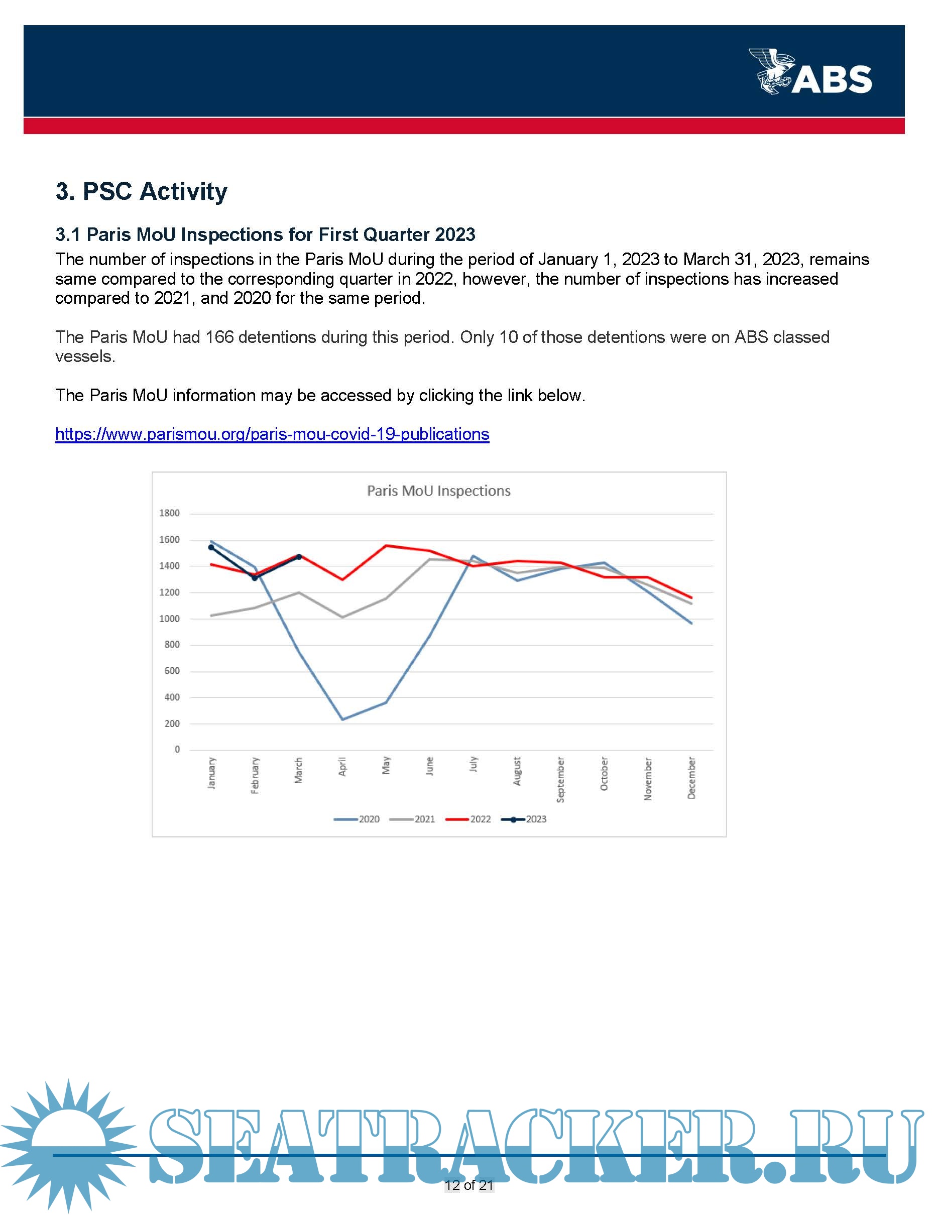 Description: This ABS Quarterly Report on Port State Control (PSC) provides information to owners on deficiencies identified on ABS vessels during inspections carried out by the various PSC regimes globally during the first quarter of 2023. This report is being made available to assist owners by providing awareness of potential areas of concern that have been identified on ABS classed vessels.