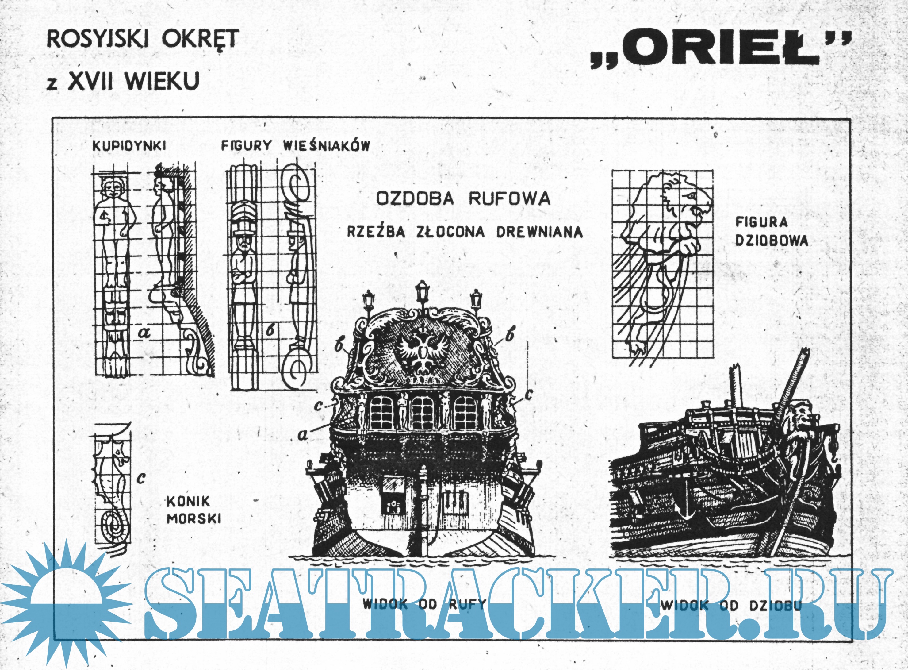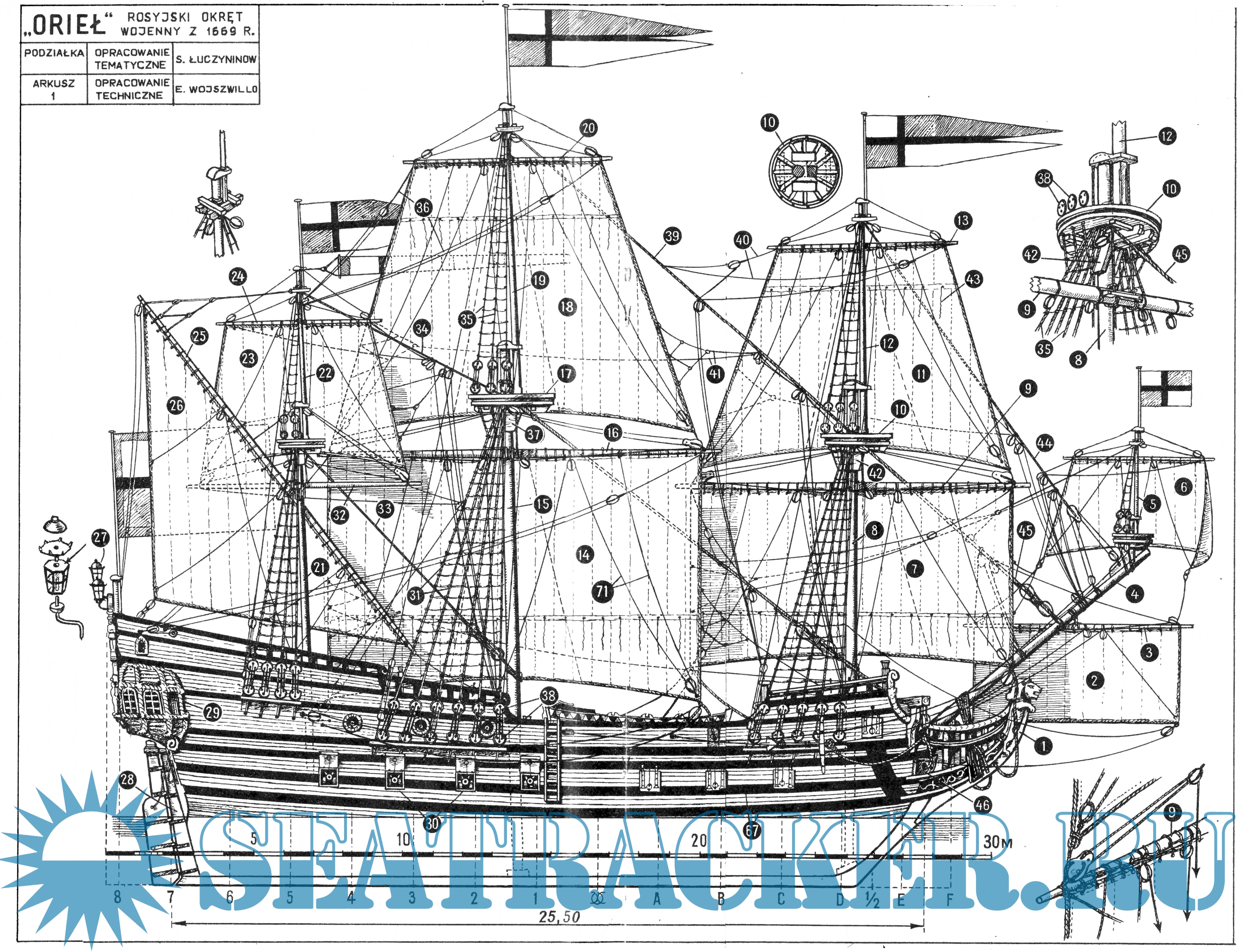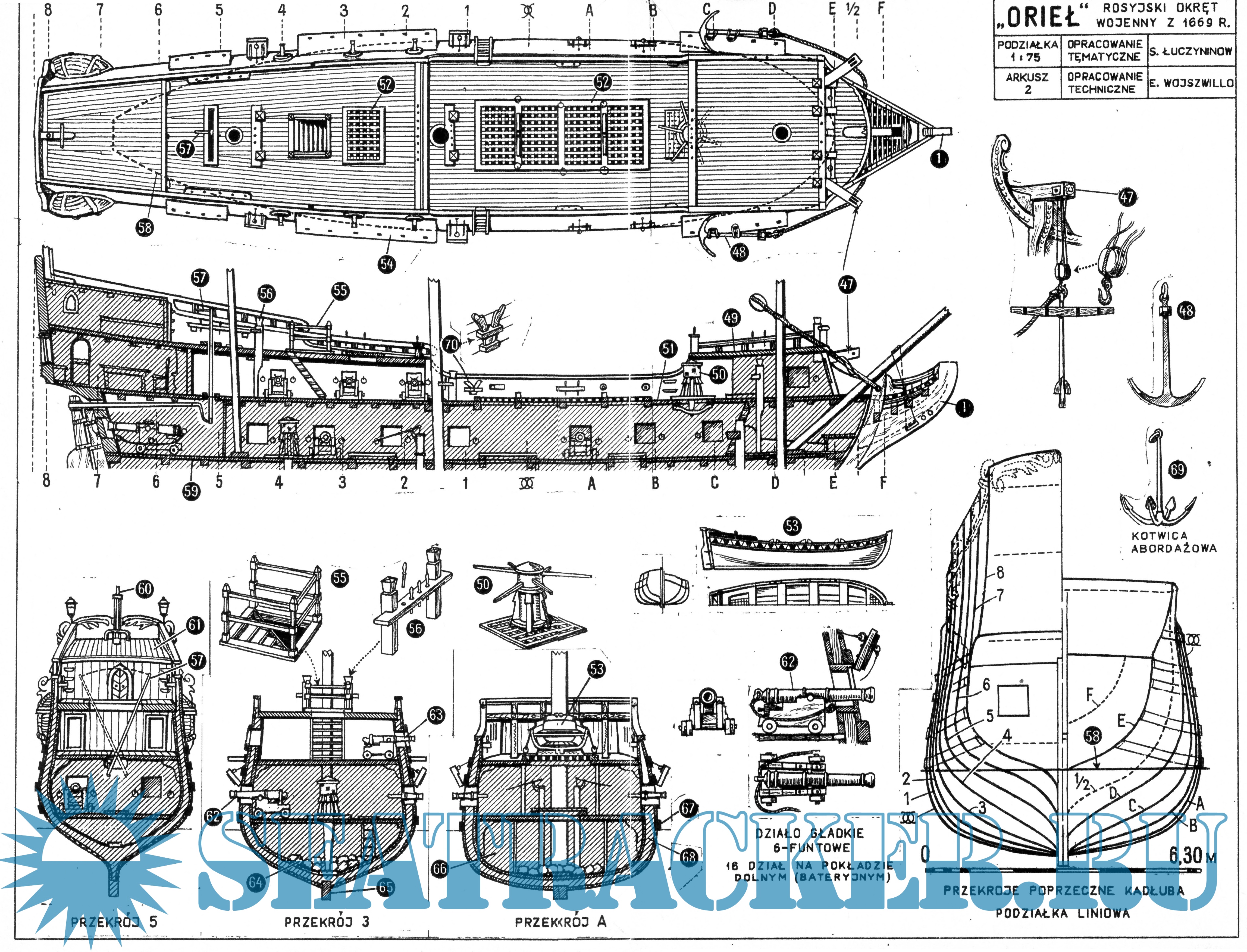5 листов чертежей парусного корабля ОРЁЛ Россия 1669 год в масштабе 1:76