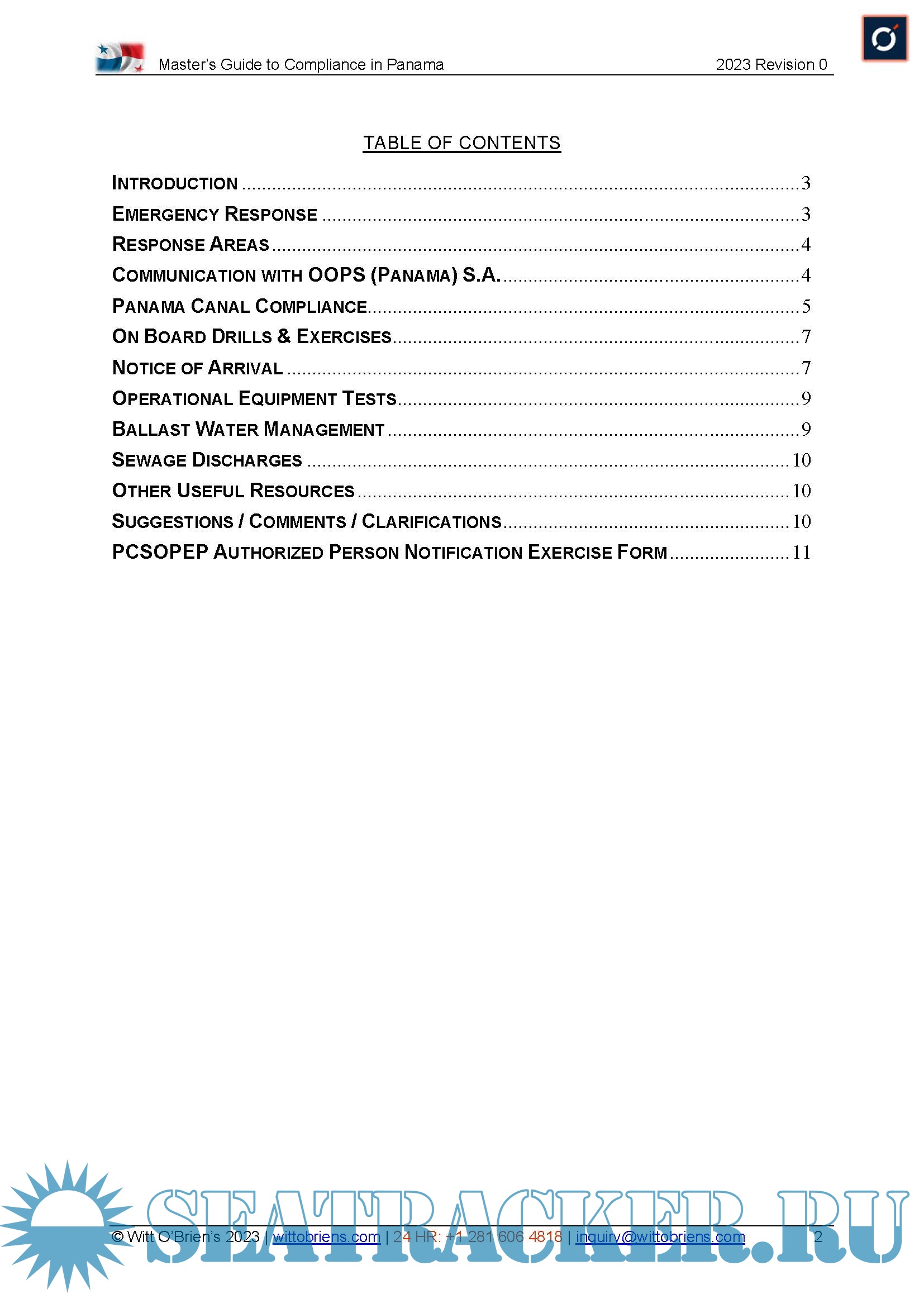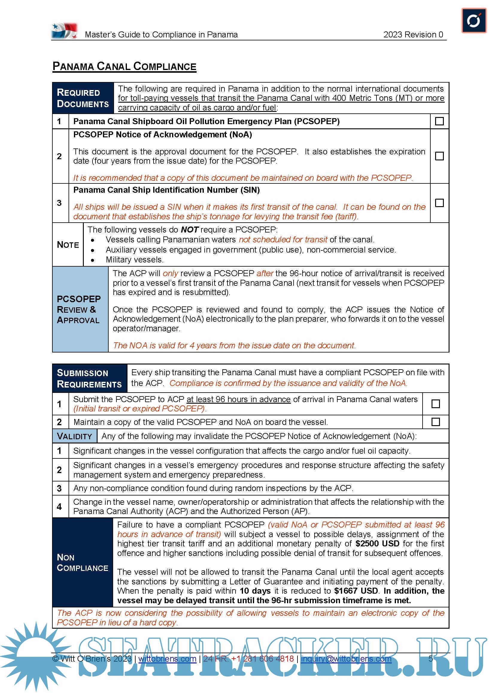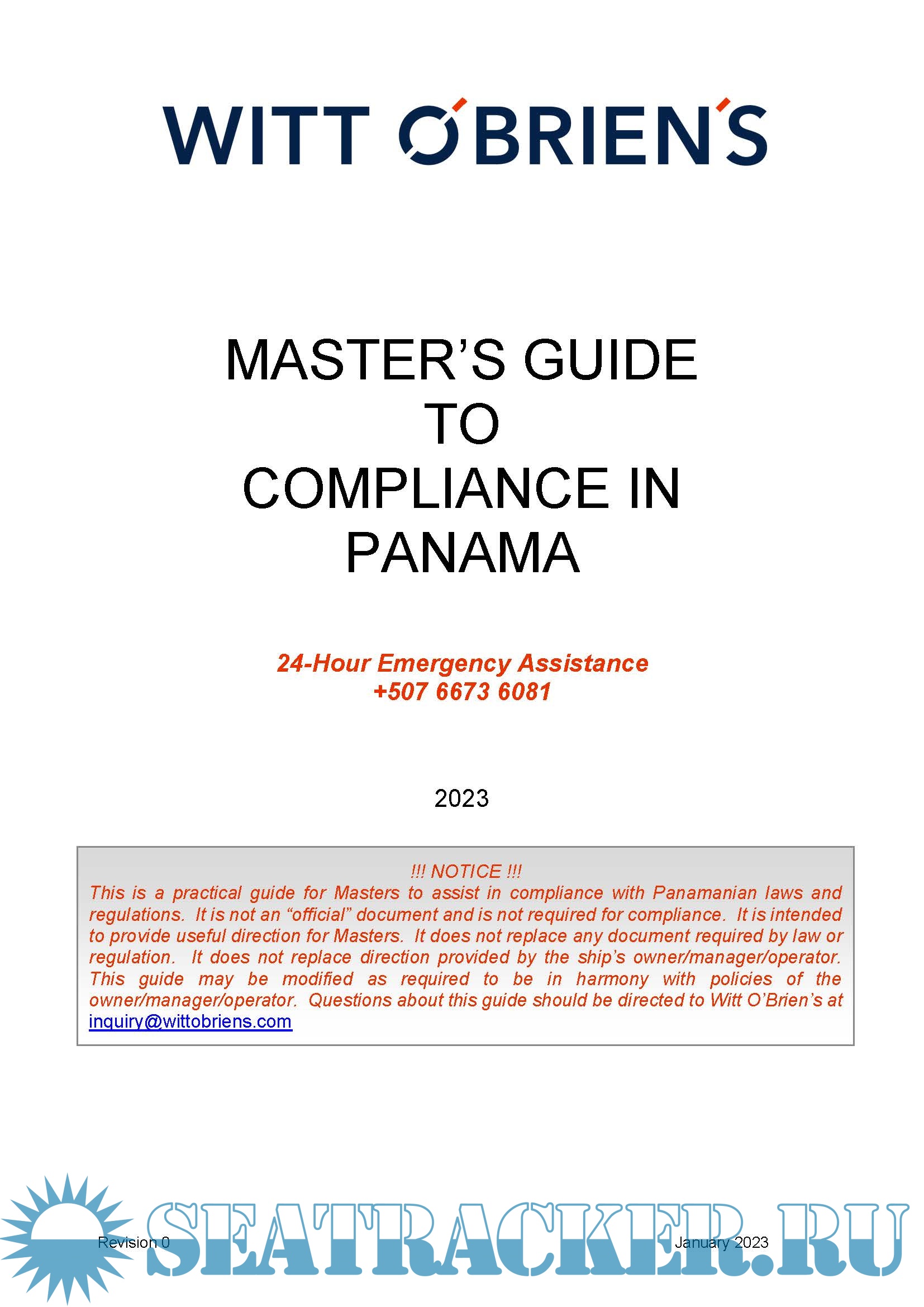 Year: 2023 Language: english Author: Witt O'Brien's Genre: Guide Edition: Revision 0 January 2023 Format: PDF Quality: eBook Pages count: 11 Description: The Master of any vessel making a call to Panama faces several regulatory issues that are specific to Panama especially when transiting the Panama Canal. Your vessel is enrolled with OOPS (Panama) S.A. to ensure compliance with Panamanian regulations. This guide is intended to help the Master effectively and efficiently face these issues. Use of the directions in the guide will allow OOPS (Panama) to better serve you. Information designed to save you time and effort is present in orange italics. update for: