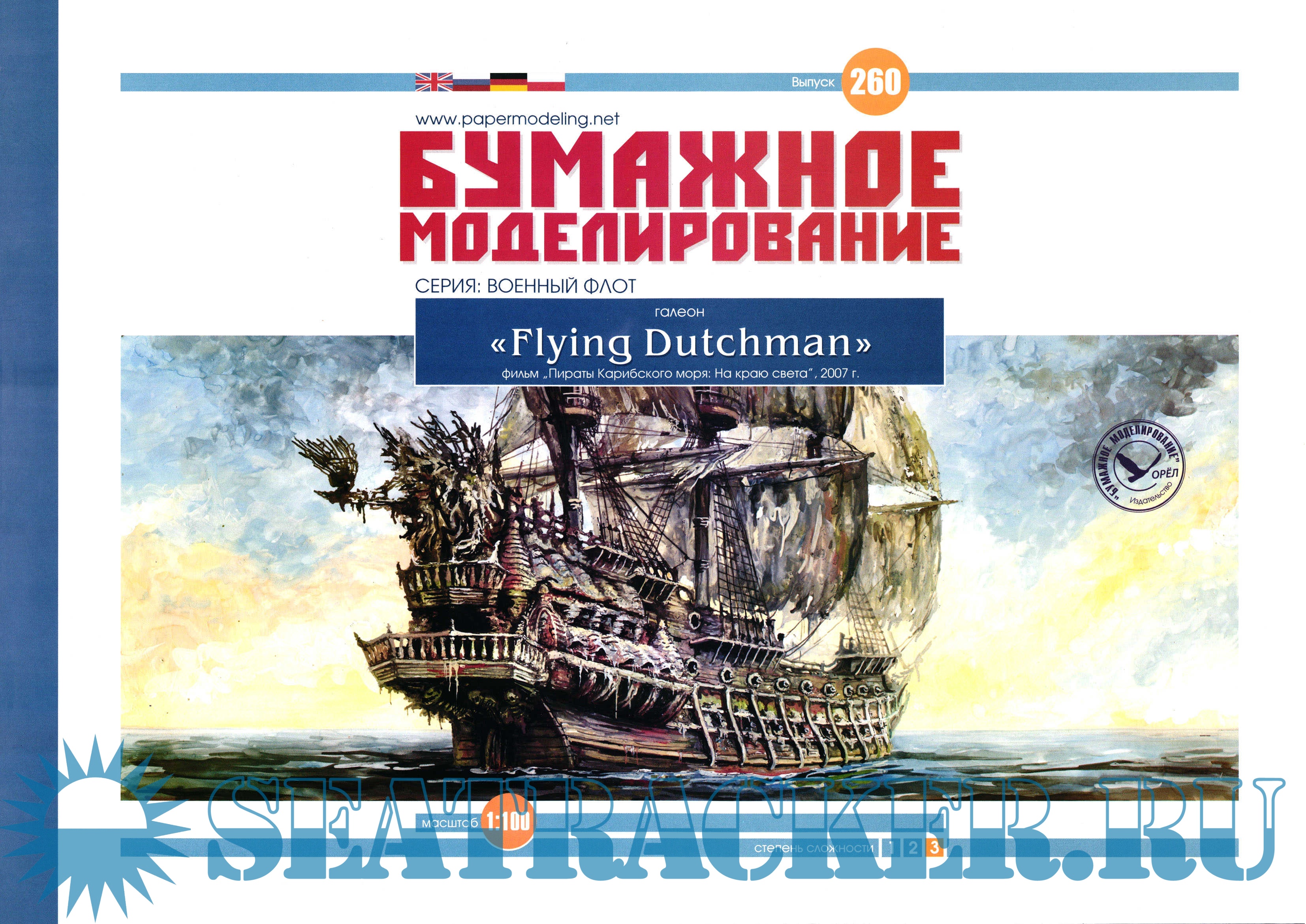 27 листов цветных выкроек и описаний для создания бумажной модели галеона "Flying Dutchma" из фильма "Пираты Карибского моря. На краю света", 2007 год в масштабе 1:100