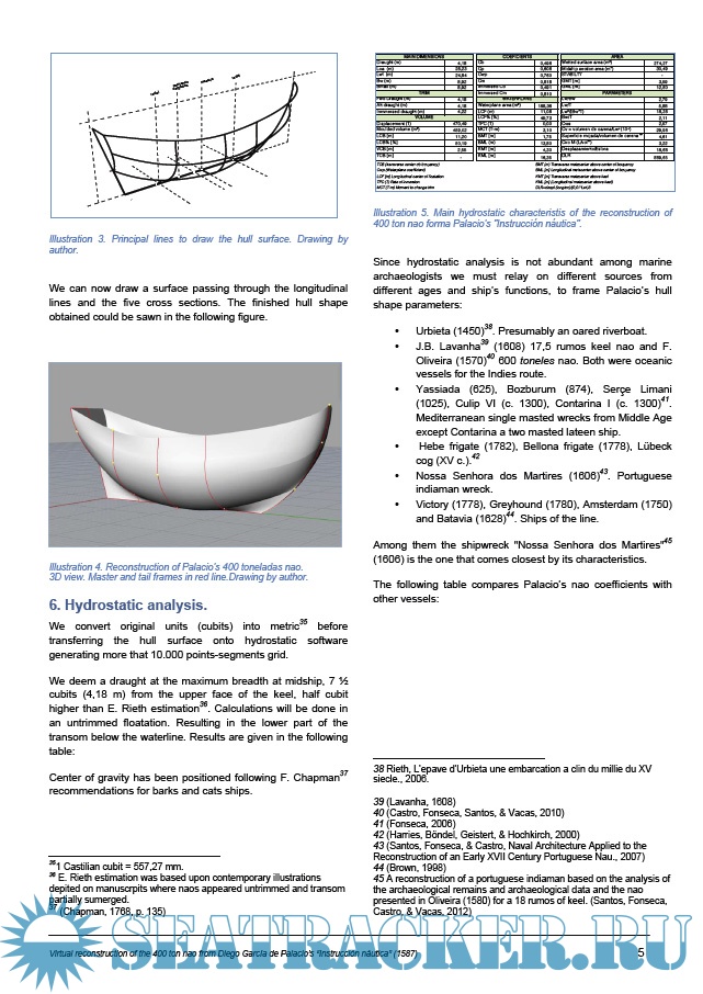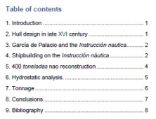 Description: The period between 1570-1620 has left a remarkable amount of documents related to shipbuilding in the Iberian Peninsula. Among them, the Instrucción náutica written by Diego García de Palacio in 1587 is widely recognized as the first published book that includes an extensive discussion of ship design and construction. García de Palacio centres his discussion on a 400 toneladas nao, a series of woodcuts that illustrate the shape and dimensions of the ship accompany the explanation. In the late XVI century ship hulls were designed following procedures based upon an old shipwrightry tradition born in the Mediterranean. By simple rules the master shipwright plots the central frame and tail frames and complete the hull body using wooden ribbands. Computer software for 3D modelling using NURBs surfaces helps to recreate ships hulls. In this work the 400 toneladas nao is reconstructed and her hydrostatic parameters are compared with other ships.