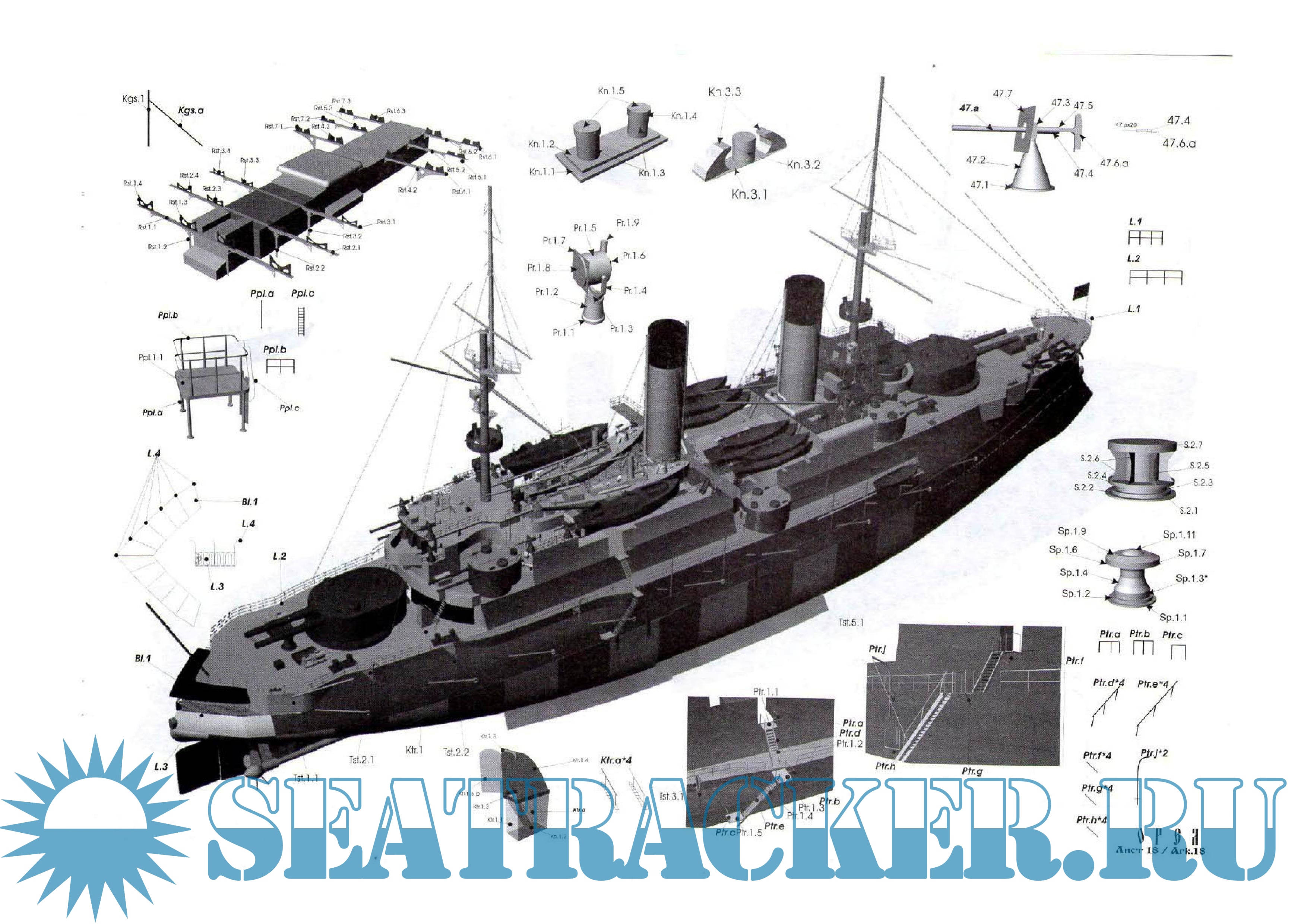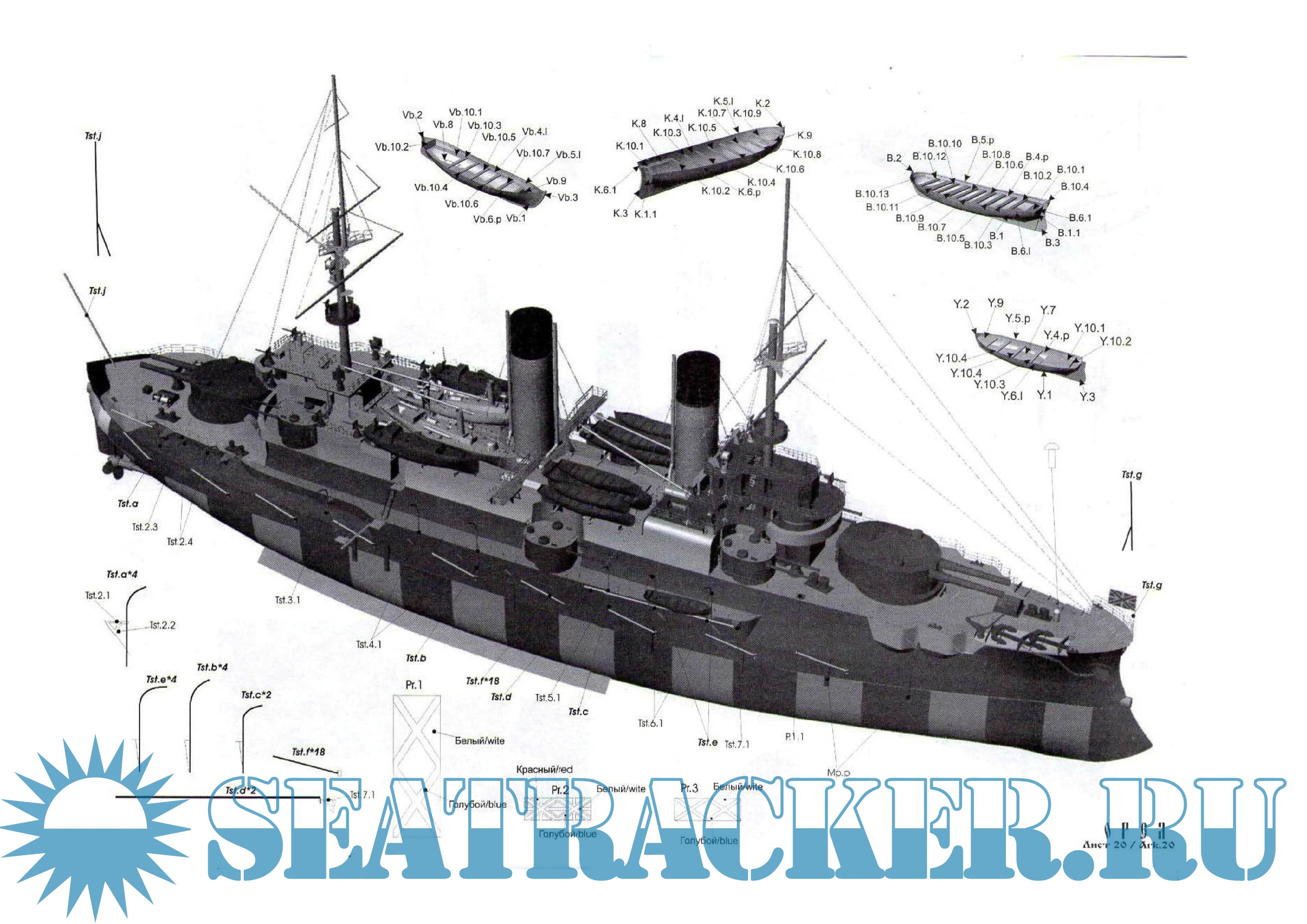 Описание: 20 листов цветных выкроек и инструкций для изготовления бумажной модели броненосца «Орёл» 1904 год