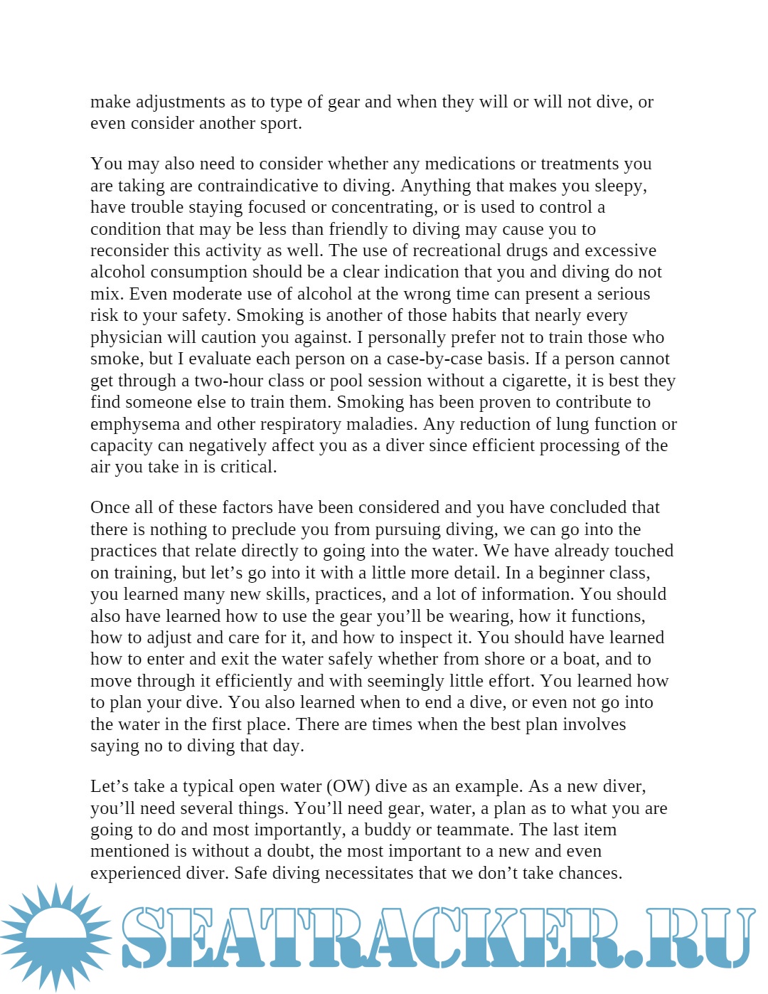 Description: SCUBA is a fun, relaxing, educational, interesting, and -- if approached properly -- safe activity, it is nonetheless a sport that has risks. SCUBA diving is in fact an extreme sport that can injure or even kill very quickly, and in some very nasty ways. What we are doing is entering an alien environment that is normally hostile to human life. We cannot breathe in water without some kind of mechanical assistance. These are facts and the details should be covered in every Open Water (OW) class. All too often in today’s society, however, people do not want to take the time to properly prepare and get the education to safely take on new tasks. Some agencies appear to have responded to this by developing training programs that turn out high numbers of certified divers in shorter time frames, necessitating the reduction of time spent on what I consider to be some necessary basic skills.