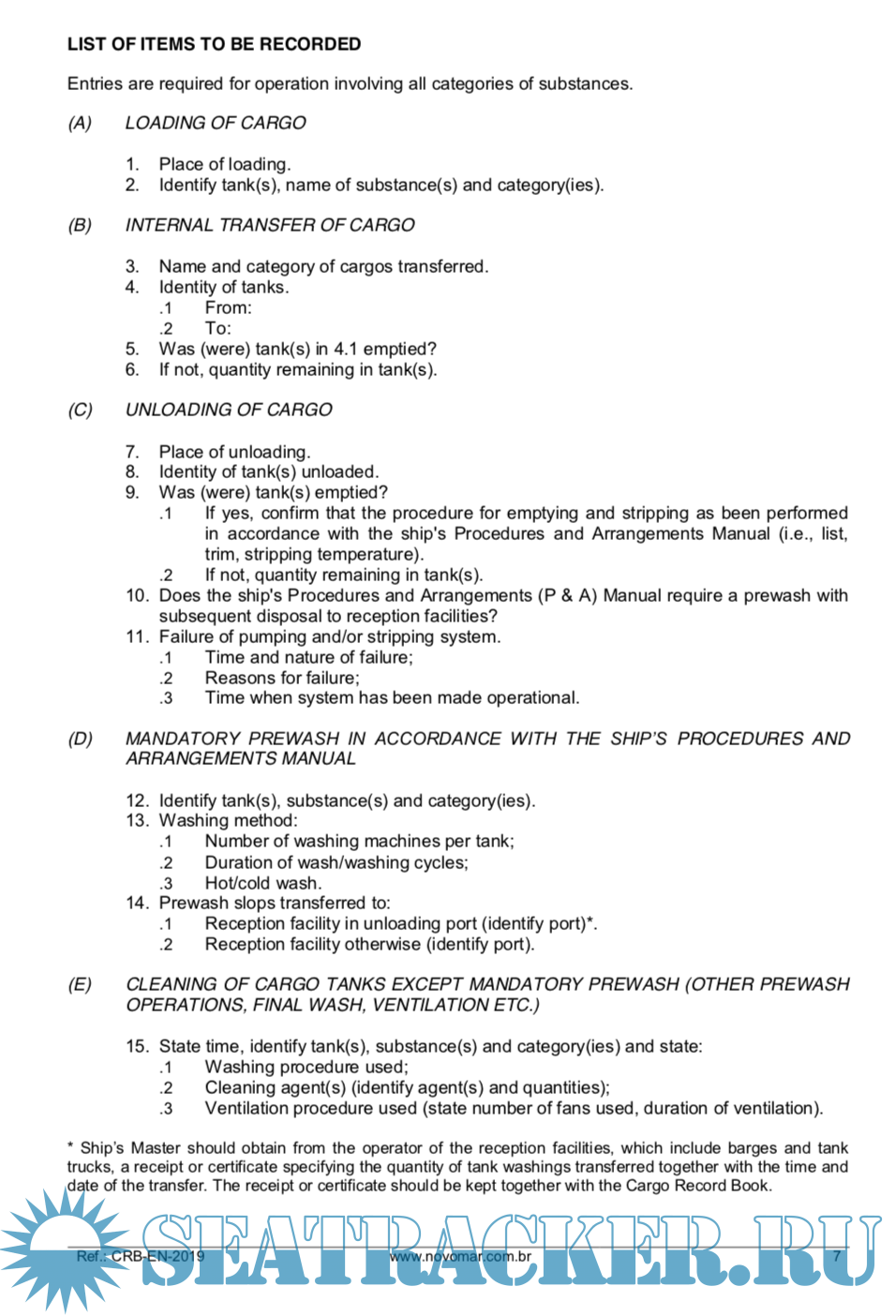 The Book shall be completed on a tank to tank basis whenever a ship loads, internally transfers, or unloads NLS in bulk or any mixture containing such substance; whenever a ship cleans or ballasts the NLS cargo tanks; whenever a ship discharges ballast from the NLS cargo tanks or disposes of NLS residue or any mixture containing such substance to a reception facility; whenever a ship discharges any NLS or any mixture containing such substance, whether intentional or accidental into the water; and whenever a ship removes by ventilation NLS residues.