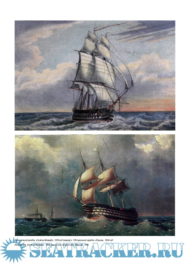Трехдечные линейные корабли 120-пушечного ранга "Двенадцать Апостолов" (1841 год), "Париж" (1849 год) и "Великий князь Константин" (1852 год), несмотря на большие размеры, достигали скорости 12 уз, а мощное артиллерийское вооружение новейших образцов ставило их на один уровень со своими английскими и французскими аналогами.