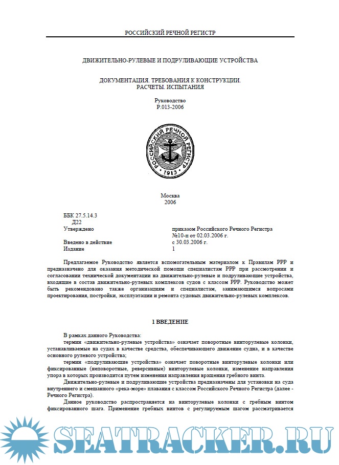 Описание: Руководство является вспомогательным материалом к Правилам РРР и предназначено для оказания методической помощи специалистам РРР при рассмотрении и согласовании технической документации на движительно-рулевые и подруливающие устройства, входящие в состав движительно-рулевых комплексов судов с классом РРР. Руководство может быть рекомендовано также организациям и специалистам, занимающимися вопросами проектирования, постройки, эксплуатации и ремонта судовых движительно-рулевых комплексов.
