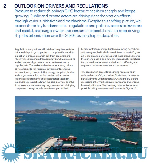 The maritime industry will go through a period of rapid energy and technology transition that will have a more significant impact on costs, asset values, and earning capacity than many earlier transitions. Shipowners are already experiencing increasing pressure to reduce the greenhouse gas footprint of maritime transport. This report provides an updated outlook on the regulatory and commercial drivers for decarbonization of shipping: — Three fundamental key drivers will push decarbonization in shipping in the coming decade: regulations and policies, access to investors and capital, and cargoowner and consumer expectations. — The Initial IMO GHG Strategy currently drives policy development within international shipping, and the first wave of regulations will take effect from 1 January 2023 (i.e. EEXI, CII). We expect them to have a significant impact on design and operations of all ships. — While all ships need to fulfil the minimum compliance requirements from the IMO, commercial pressure may push shipowners to aim for a leading position in decarbonization, as we expect that poorly performing shipping companies will be less attractive on the charter market, and may also struggle to gain access to capital.