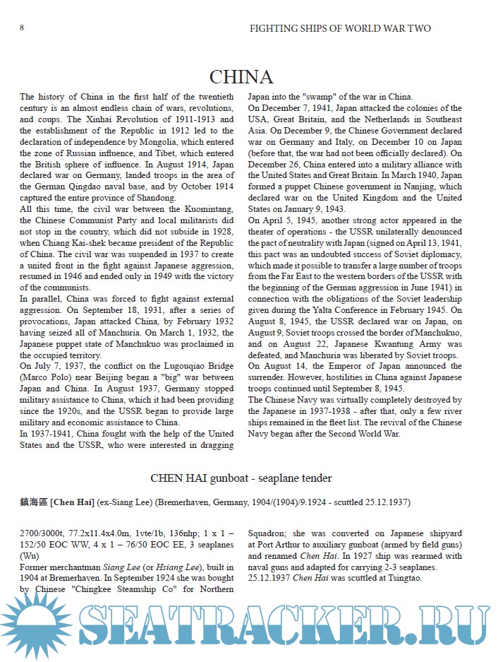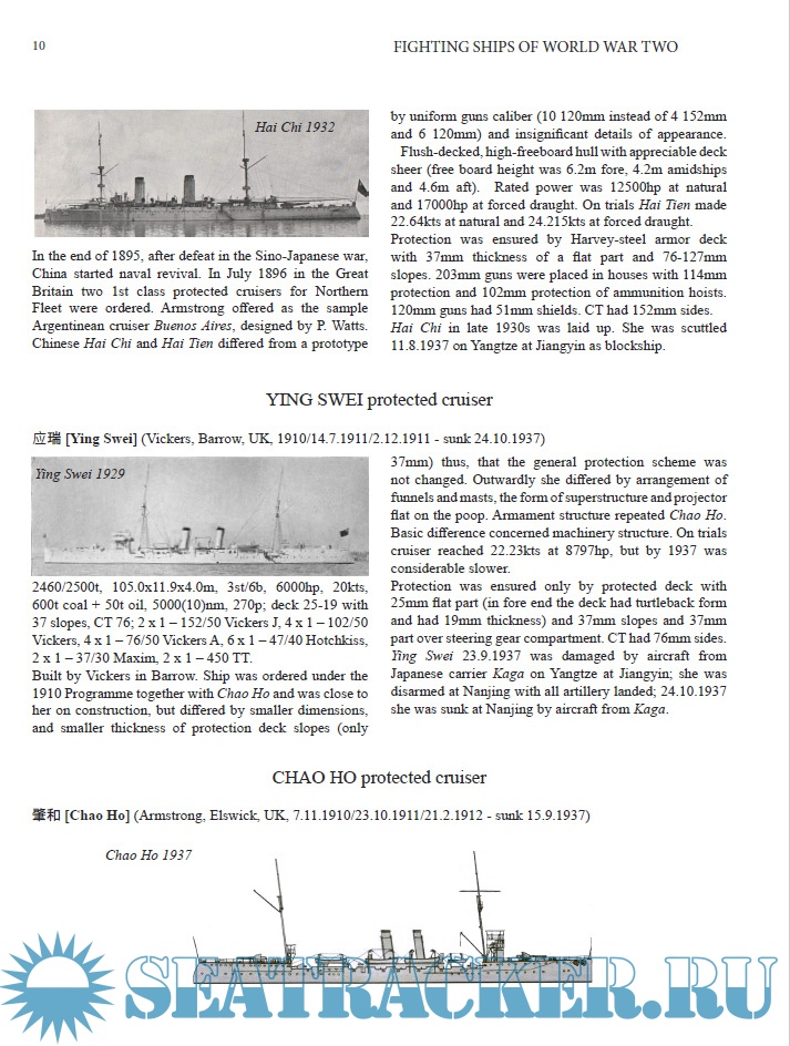 Description: This book, the ninth in the "Fighting ships of World War Two" series, contains reference information about all fighting ships and boats of Asian, African and Latin American navies, not described in previous volumes, served, built or ordered in days of the Second World War. Articles contain information about designing, building and service of all ships and their technical data and modernization. Texts are accompanied by many photos and side view drawings. Volume contains information about the navies and riverine flotillas of following countries: China, Iran, Iraq, Manchukuo, Philippines, Siam (Thailand), Turkey, Egypt, Argentina, Brazil, Chile, Colombia, Cuba, Dominican Republic, Ecuador, Haiti, Mexico, Paraguay, Peru, Uruguay, Venezuela.