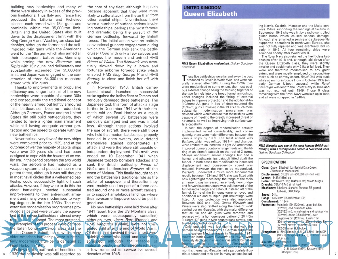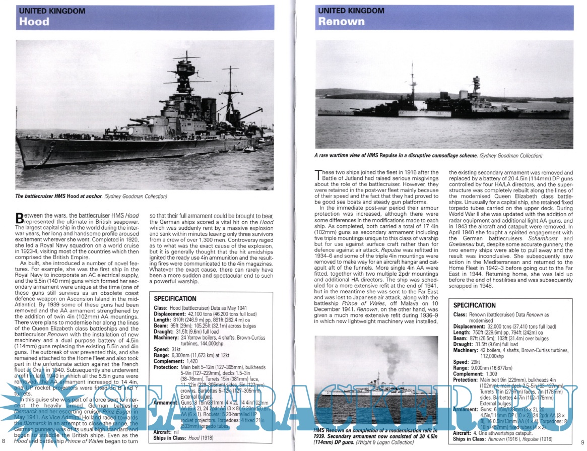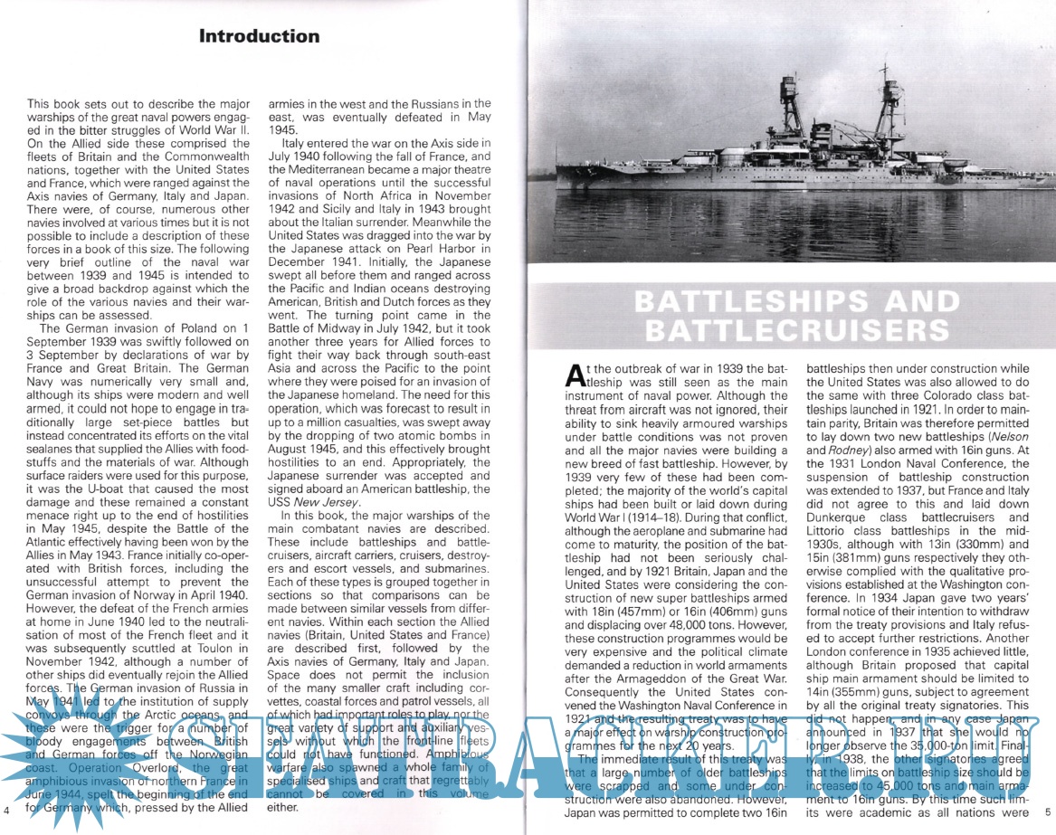 Description: This book includes the principal ships that were engaged in the war at sea between 1939 and 1945. The mighty battleships and cruisers that roamed the oceans, great aircraft carriers deployed in the Mediterranean and Pacific campaigns and the hard-pressed destroyers and U boats engaged in the Battle of the Atlantic are all described and illustrated. The book is divided into sections on battleships and battlecruisers, aircraft carriers, cruisers, destroyers and submarines. Specifications include displacement, length, draught, power-plant, speed and range, complement and weapons.
