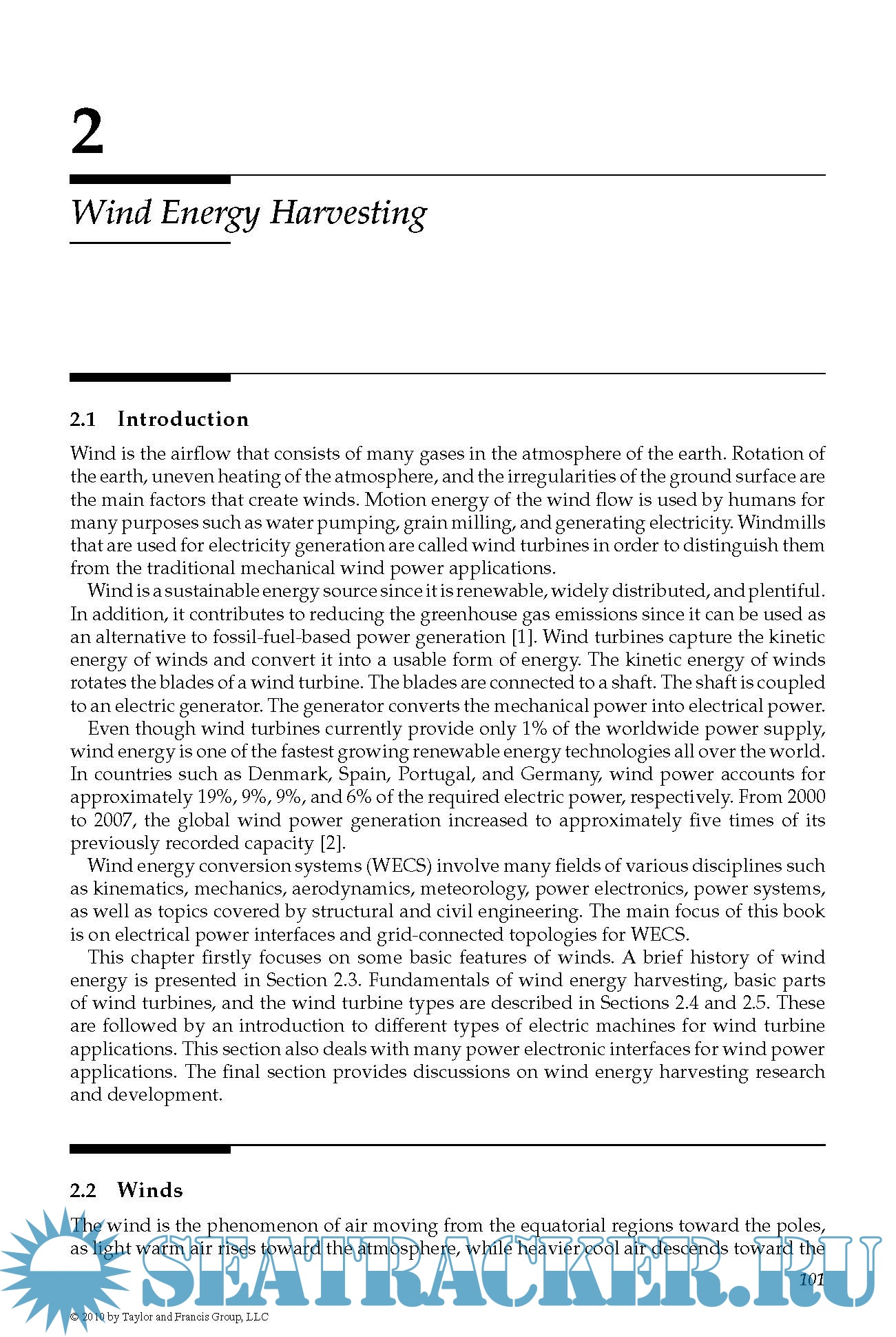 Year: 2010 Language: english Author: Alireza Khaligh, Omer C. Onar Genre: Technical book Format: PDF Quality: eBook Pages count: 368 Description: Increasing demand for energy, decreasing conventional fossil-fuel energy sources, and environmental concerns are driving forces toward renewable energy sources. Energy sources such as oil, coal, and gas are being quickly depleted or have insufficient reserves for future demands. Moreover, they are not environmental friendly due to greenhouse gas emissions and other pollutants. Nuclear energy has a great establishment cost along with a number of safety concerns. On the other hand, hydroelectric power plants are inexpensive but have a limited life span and mostly cannot be utilized due to geo-political reasons and seasonal irregularity of available water. Therefore, the contribution from renewable energy sources is increasing. Since the world today is experiencing a great shortage of energy, it should be captured, stored, conditioned, and utilized by alternative techniques. Energy demand will always increase with the increase in technological developments while conventional sources will diminish and environmental concerns will gain increased attention. Energy harvesting, also called energy scavenging, is a concept by which energy is captured, stored, and utilized using various sources by employing interfaces, storage devices, and other units. Unlike the conventional electric power generation systems, in the renewable energy harvesting concept, fossil fuels are not used and the generation units can be decentralized. Therefore, the transmission and distribution losses can be significantly reduced. There are many sources for harvesting energy. Solar, wind, ocean, hydro, electromagnetic, electrostatic, thermal, vibration, and human body motion are renewable sources of energy. Economic, environmental, and geopolitical constraints on global conventional energy resources started forcing the nation to accelerate energy harvesting from renewable sources. Therefore, advanced technical methods should be developed to increase the efficiency of devices in harvesting energy from various environmentally friendly resources and converting them into electrical energy. These developments have sparked interest in many communities such as science, engineering, and education to develop more energy harvesting applications and new curriculums for renewable energy and energy harvesting topics. This book describes various energy harvesting technologies such as solar, wind, ocean wave, ocean tidal, and ocean thermal energy harvesting along with many different topologies and many types of power electronic interfaces for the utilization and/or grid connection of energy harvesting applications. In addition, some simulation models are developed throughout the book in order to build an insight to system analysis and modeling. In the book, the concepts and theoretical background are built for energy harvesting applications.