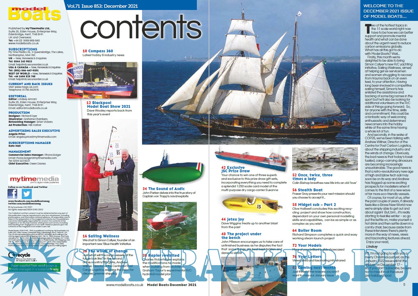Description: Model Boats magazine is a practical and informative read for those with a love for the hobby. It covers the latest news and views from the various clubs and associations around the country, useful hints, tips and step by step guides for those interested in the art of constructing a model boat as well as tests and recommendations of new boats and tools. Floating along behind these are great special features examining in depth different models from narrowboat to destroyer!