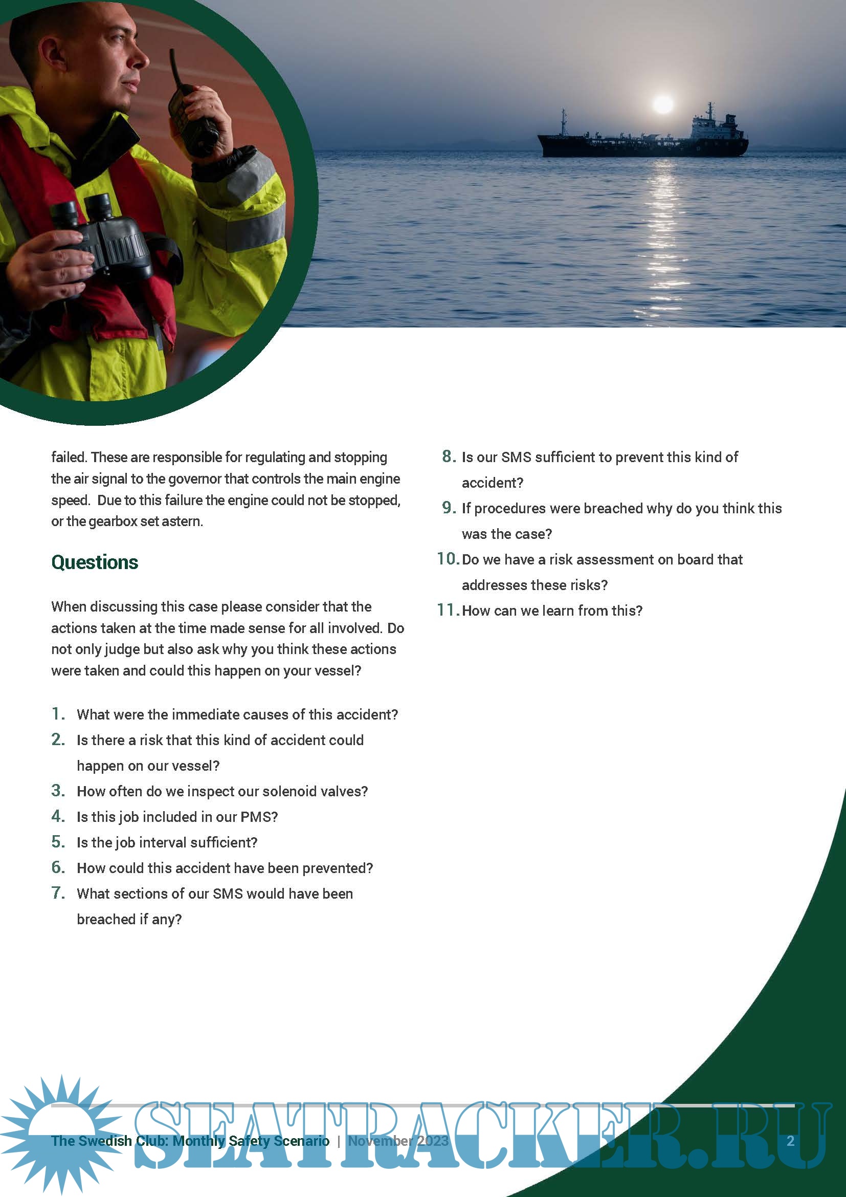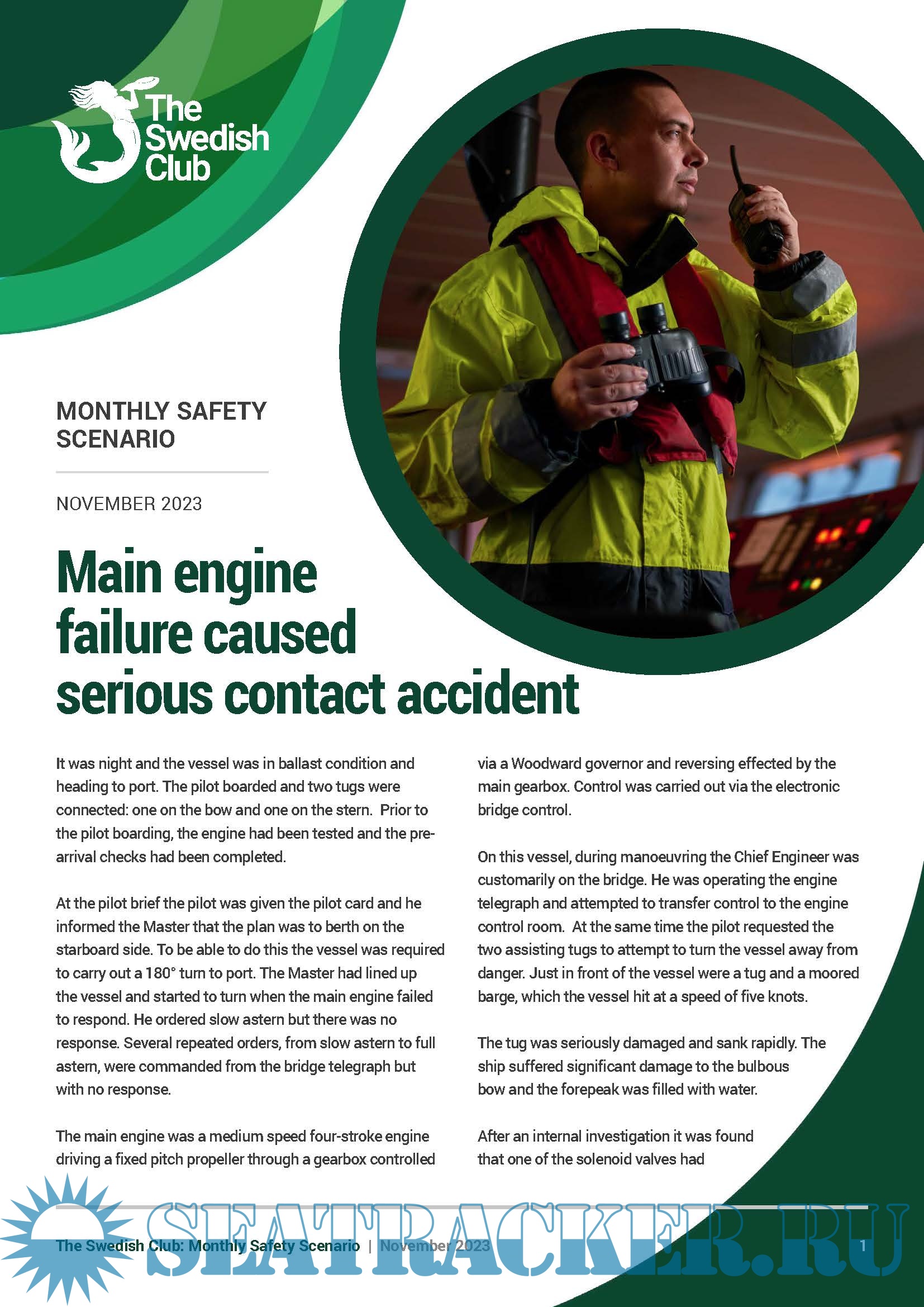 Year: 2023 Language: english / russian Author: the Swedish Club Genre: Periodical Format: PDF Quality: eBook Pages count: 3 Description: The Club is publishing, on a monthly basis, a new Monthly Safety Scenario (MSS) to assist owners in their efforts of complying with the above regulations. Alternative scenarios will be uploaded in SCOL. It is easy to download the MSS and enter the written conclusions from the meeting and send feedback to the shore-based organisation. Issue November, 2023 | Main engine failure caused serious contact accident Under the ISM requirement, owners are obliged to carry out monthly safety meetings or safety committee meetings onboard their vessels. This obligation stems from Chapter 5 of the ISM Code: “Master’s responsibility and authority” and furthermore from “5.1.2, motivating the crew in the observation of that policy”.