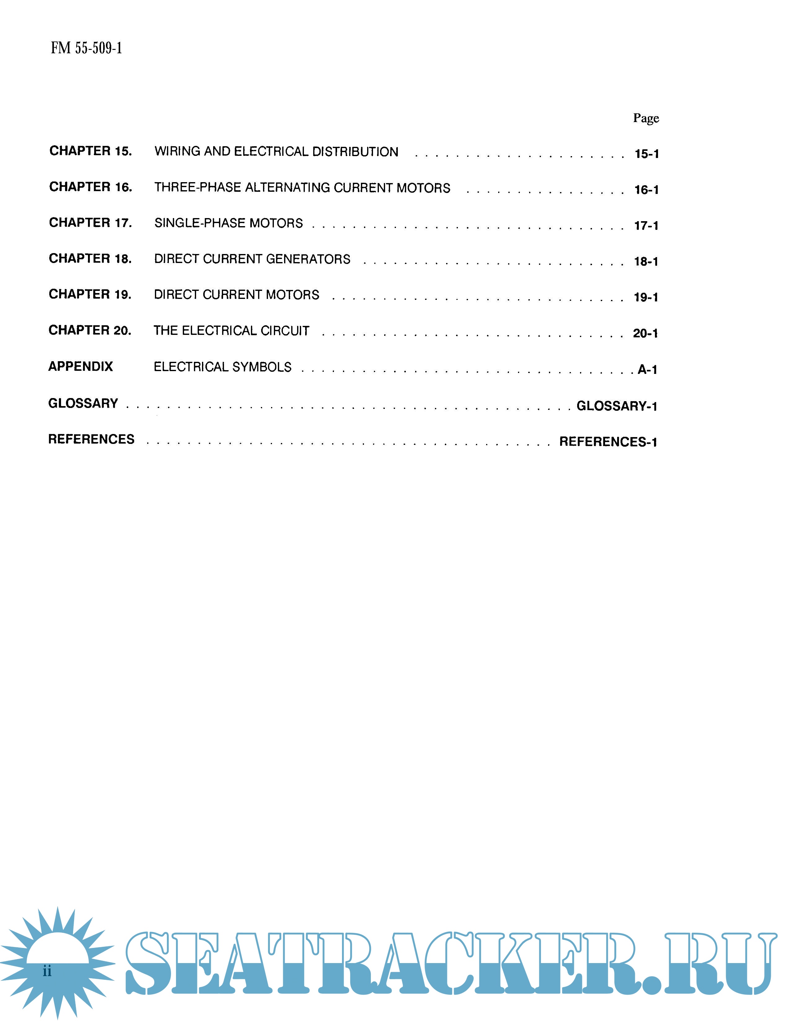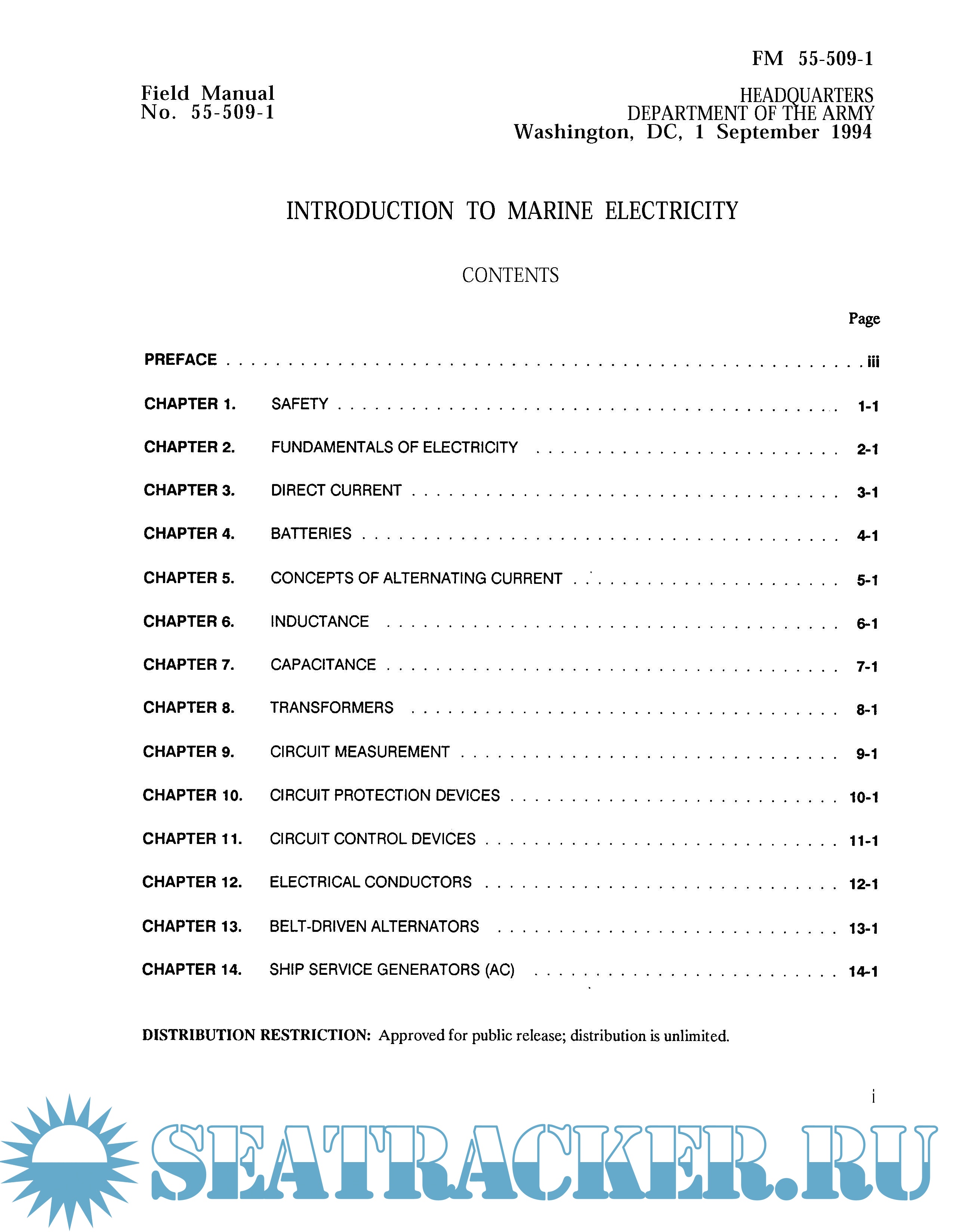 Year: 1994 Language: english Author: US Army Genre: Handbook Format: PDF Quality: eBook Pages count: 369 Description: This manual is an electrical reference text for the marine engineering field. It provides information for the 88L10, 88L20, 88L30, 88L40, 881A1, and 881A2 military occupational specialties (MOSs). This text reinforces good marine electrical practices. A good knowledge of marine electricity helps maintain the health and welfare of the crew by promoting the safe operation of the many electrical systems on board a vessel. This manual covers marine electrical safety and alternating current (AC) and direct current (DC) fundamentals. It details the vessel distribution system as well as circuit protection and the electrical motor load. This information corresponds with the program of instruction presented to the marine engineering students at Fort Eustis. The marine engineer must understand the entire production, distribution, and user end of the electrical process. He will be required to maintain and overhaul all the electrical apparatus for safely operating the vessel.