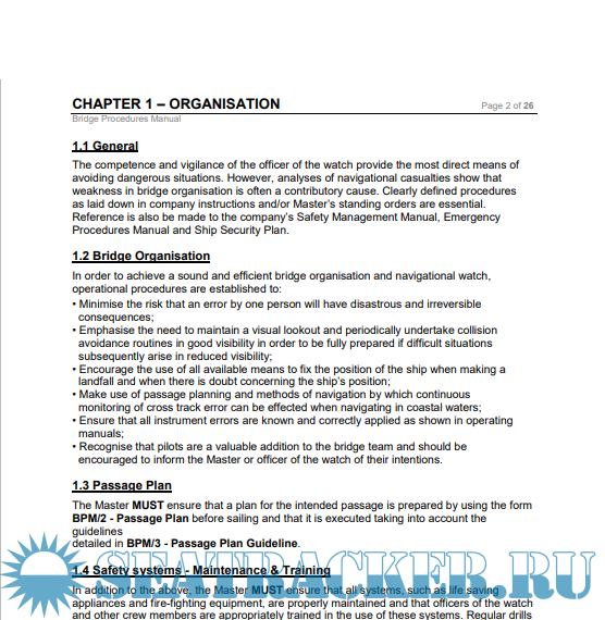 The manual typically includes detailed procedures and protocols related to navigation, bridge equipment operation, communication, collision avoidance, emergency response, and adherence to international maritime regulations and best practices. It serves as a reference guide for the ship's officers and crew, providing them with step-by-step instructions and checklists to follow during various navigational scenarios and operations.