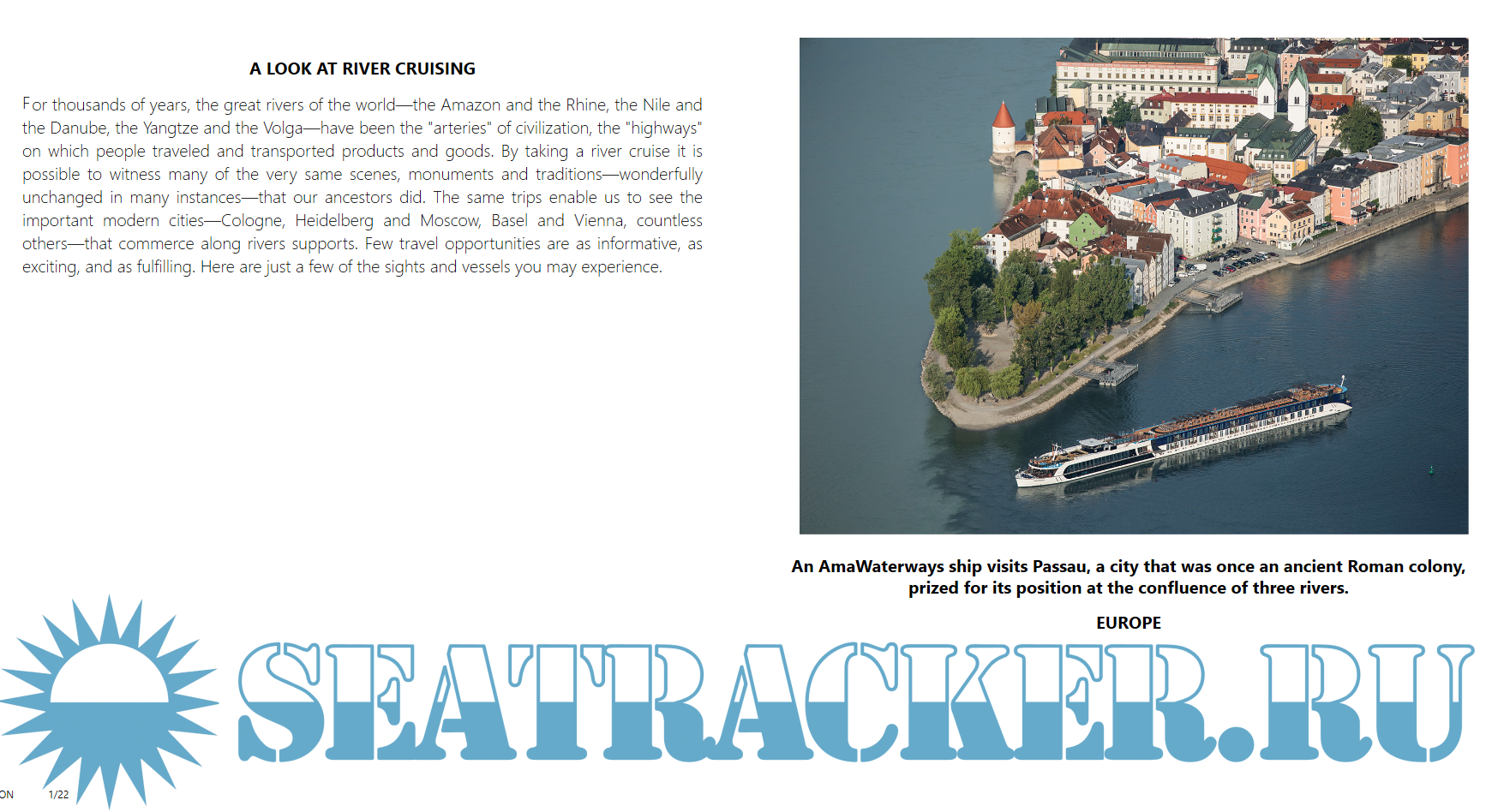 Description: For thousands of years, the great rivers of the world—the Amazon and the Rhine, the Nile and the Danube, the Yangtze and the Volga—have been the "arteries" of civilization, the "highways" on which people travelled and transported products and goods. By taking a river cruise it is possible to witness many of the very same scenes, monuments and traditions—wonderfully unchanged in many instances—that our ancestors did. The same trips enable us to see the important modern cities—Cologne, Heidelberg and Moscow, Basel and Vienna, countless others—that commerce along rivers supports. Few travel opportunities are as informative, as exciting, and as fulfilling. Here are just a few of the sights and vessels you may experience.