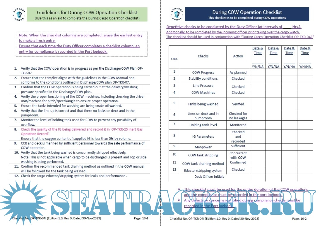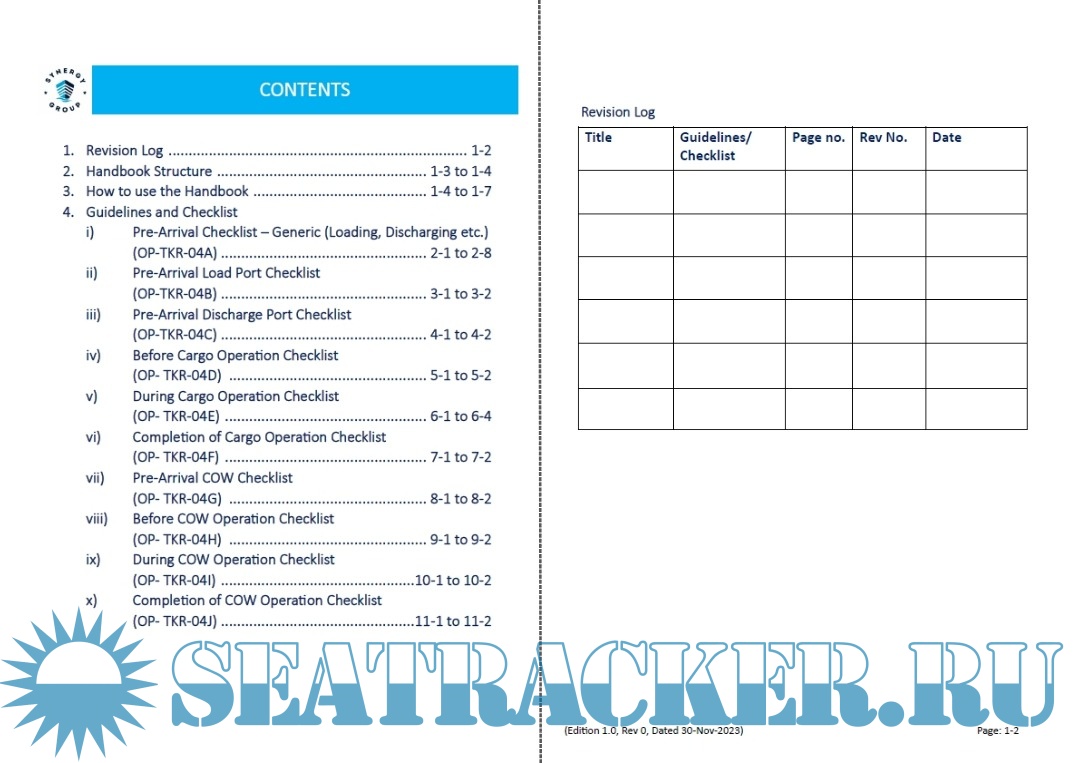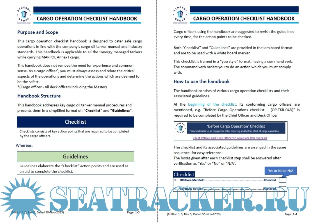 Description: This cargo operation checklist handbook is designed to cater safe cargo operations in line with tne company's cargo oil tanker manual alild industry stalildards. This handbook is applicable to all the Synergy managed tanlkers while carrying MARPOIL Annex I cargo.
