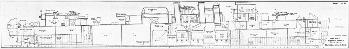 Описание: 8 листов чертежей эсминца США DMS-5 (ex DD-161) - USS Palmer (тип «Wickes») на 1943 год.
