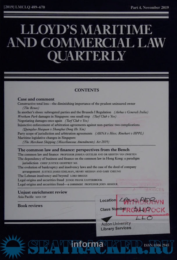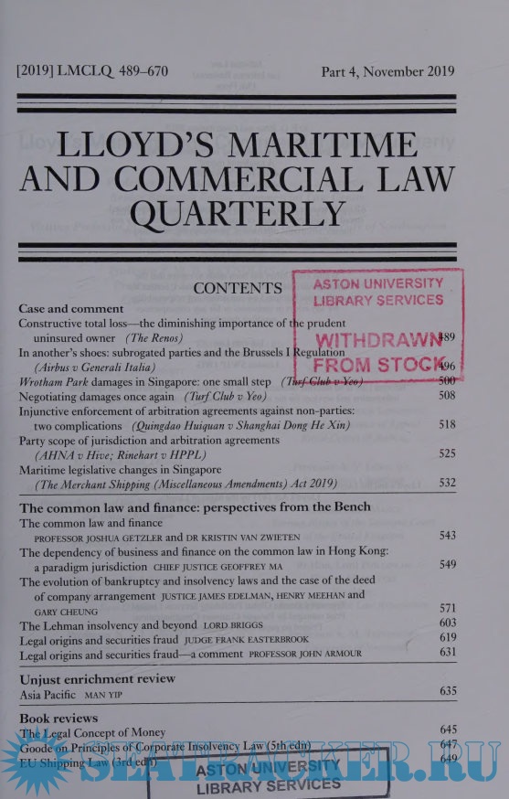 Year: 2019 Language: English Author: F.D Rose Genre: Handbook Publisher: informa Format: PDF Quality: Scanned pages + text layer Pages count: 240 Description: Lloyd’s Maritime and Commercial Law Quarterly is the leading journal internationally on all aspects of shipping and maritime law, international trade, commercial law and associated areas of law. It includes original, thoroughly researched, rigorously analytical and detailed informative contributions for lawyers and practitioners in related areas on the current law and practice, and future development, of the law in the United Kingdom and internationally on arbitration, insurance, litigation, sales, shipping and commercial law generally.
