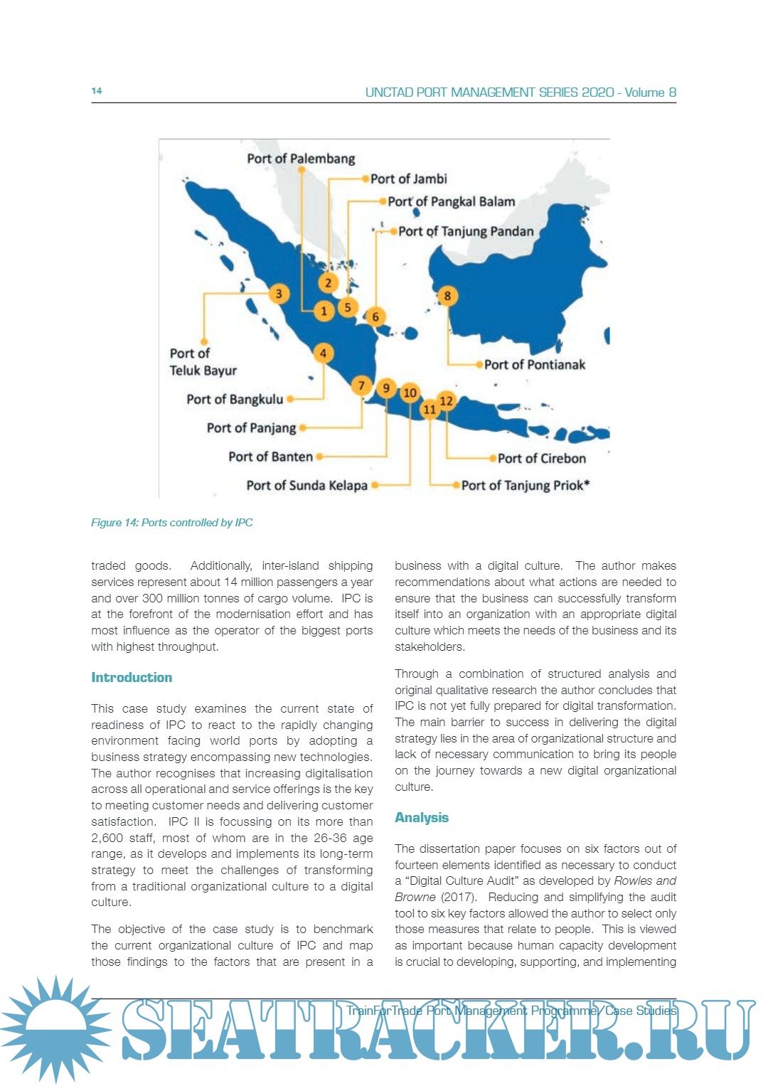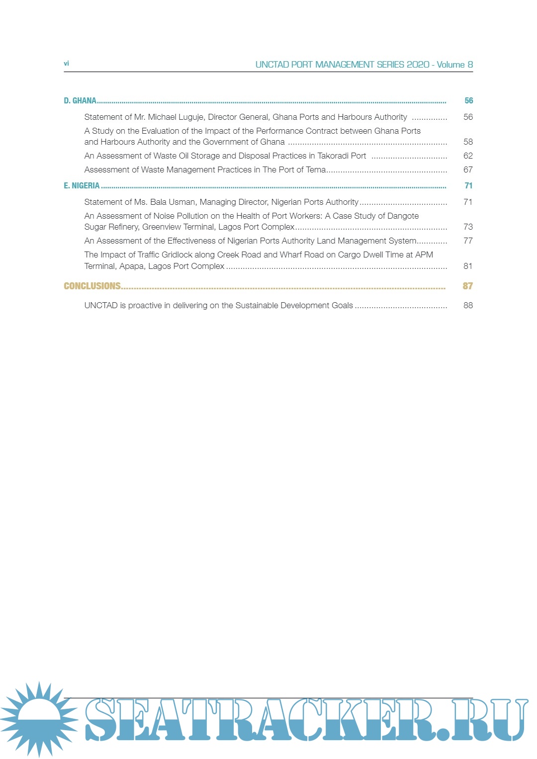 Year: 2020 Language: English Author: UNCTAD Genre: Methodological guide Publisher: UNCTAD Format: PDF Quality: eBook Pages count: 102 Description: This publication was produced within the framework of the TrainForTrade Port Management Programme of the United Nations Conference on Trade and Development (UNCTAD), financed by the Government of Ireland and the participating ports of Ghana, Indonesia, Malaysia, Nigeria and the Philippines. The programme receives support from Dublin Port Company, Port of Cork Company and Belfast Harbour Commissioners. The Port Management Programme – English Speaking Network – has benefitted since its inception in 2007 from the unstinting support of Ireland’s ambassadors in the participating countries. Their excellencies: Seán Hoy formerly in Ghana and Nigeria; Kyle O’Sullivan and Olivia Lesley in Indonesia; Eamon Hickey and Hillary Reilly in Malaysia; and Geoffrey Keating and Pat Bourne in Singapore representing the Philippines, have always given freely of their time to take part in the presentation of certificates and meet with participants. Their support and that of the Department of Foreign Affairs and Trade in Ireland is very much appreciated. The summaries of the featured dissertations and participants’ career profiles were prepared by John Moore, Janjarang Kijtikhun, Dominique Chantrel, Tomasz Kulaga, Amélie Cournoyer under the supervision of Mark Assaf, Chief of the Human Resources Development Section-TrainForTrade, UNCTAD, and the overall guidance of Geneviève Féraud, Head of the Knowledge Development Branch and Shamika Sirimanne, Director of the Division on Technology and Logistics, UNCTAD. Additional info: UNCTAD/DTL/KDB/2020/2