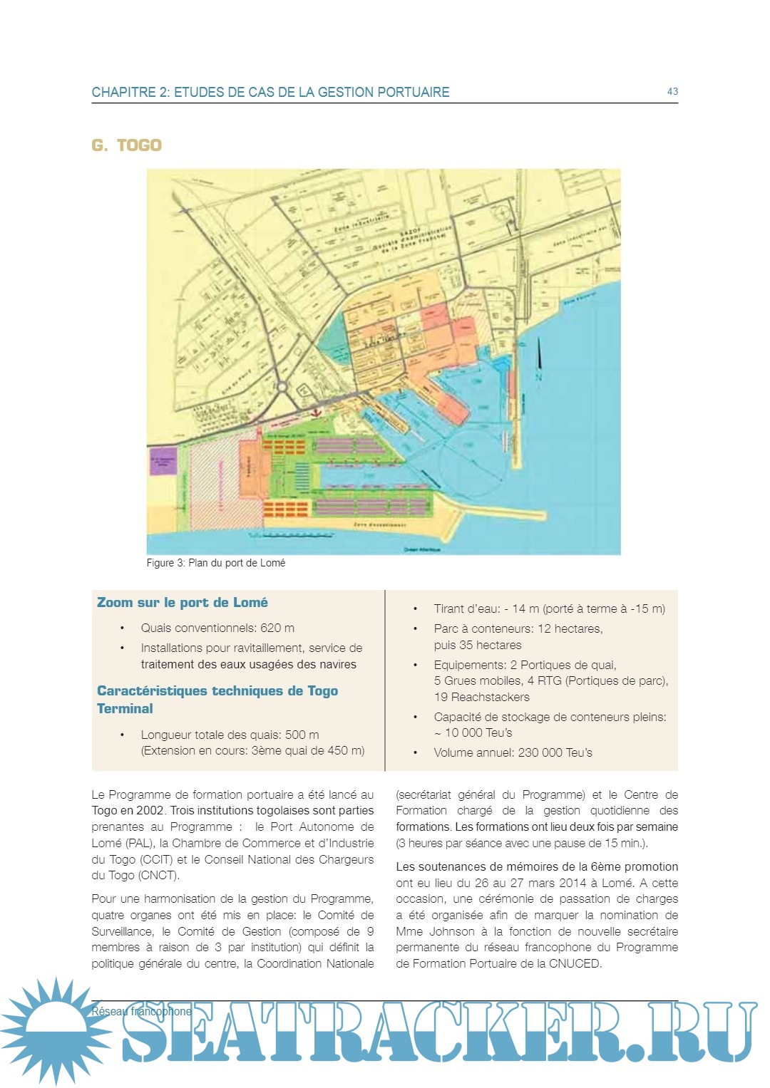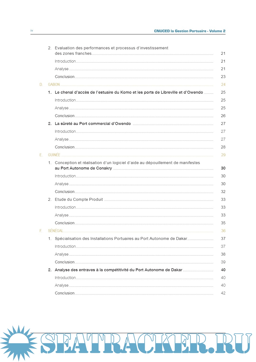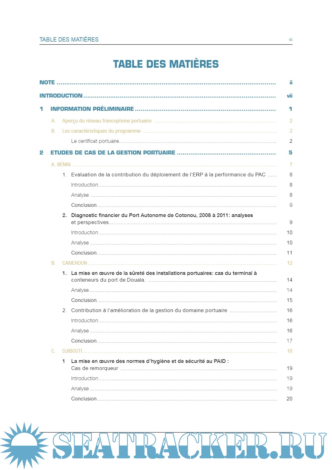 Description: Cette publication a été produite dans le cadre des activités du programme de formation portuaire TrainForTrade de la CNUCED. Elle a été financée par les ports du Bénin, Cameroun, Djibouti, Gabon, Guinée, Sénégal et Togo. Ce projet a aussi reçu le soutien des grands ports maritimes de Nantes Saint-Nazaire et de Marseille (France). Les résumés des études de cas soumises par les participants de la formation composant cette publication ont été préparés par Elodie Bardin et Carine Fabre de l’institut de formation du Port de Marseille-Fos, Alvaro Moreira et Anne Hocevar, consultants pour la CNUCED, Dominique Chantrel et Stéphanie Garcia, membres du personnel de la CNUCED, le tout encadré par Mark Assaf, Chef de la Section du développement des ressources humaines/ TrainForTrade, sous la supervision de Geneviève Féraud, Chef du Service du développement des connaissances. Dans la présente publication, les termes pays/économie désignent, selon le cas, des territoires ou des zones. Les appellations employées et la présentation des données n’impliquent de la part du Secrétariat de l’Organisation des Nations Unies aucune prise de position quant au statut juridique des pays, territoires, villes ou zones ou de leurs autorités, ni quant au tracé de leurs frontières ou limites. La mention d’une société et de ses activités ne doit pas être interprétée comme une marque de soutien de la part de la CNUCED à cette société ou à ses activités. Le texte de la présente publication peut être cité ou reproduit, sous réserve qu’il soit fait mention de la source et qu’un exemplaire de la publication où sera reproduit l’extrait cité soit communiqué au secrétariat de la CNUCED. Le présent document n’a pas fait l’objet d’une relecture par les services d’édition.