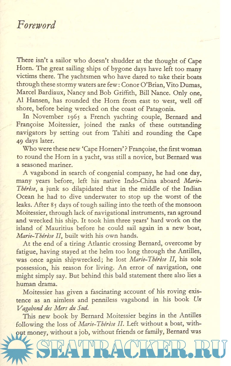 Year: 2003 Language: English Author: Bernard Moitessier Genre: Textbook Publisher: Sheridan House Edition: First ISBN: 978-1574091540 Format: PDF Quality: Scanned pages Pages count: 251 Description: This is the story of Bernard and Françoise Moitessier's honeymoon voyage aboard Joshua, sailing from Europe to the islands of the Pacific and back by way of Cape Horn, the "logical route," because it was the fastest. Setting out from Tahiti, they make their way through the Roaring Forties, iceberg territory, and the relentless gale-force winds of the higher latitudes. They owe their survival to careful preparation, superior seamanship, and their sens of harmony with Joshua and the sea. Cape Horn is also the tale of how Joshua, Moitessier's dream boat, became a reality, and how he recovered from the disaster of losing his previous boat--which he himself had built--to pursue his great love: sailing the world's oceans. Additional info: About the Author Bernard Moitessier was one of the world's great small-baot sailors. He wrote four other books, all classics of nautical literature. Sailing to the Reefs was Moitessier's first book. The Long Way covered the famous Golden Globe race that he abandoned to "save [his] soul." A Sea Vagabond's World is a practical book and Tamata and the Alliance, finished shortly before his death in 1994, is the magnificent autobiography of this uncommon man.