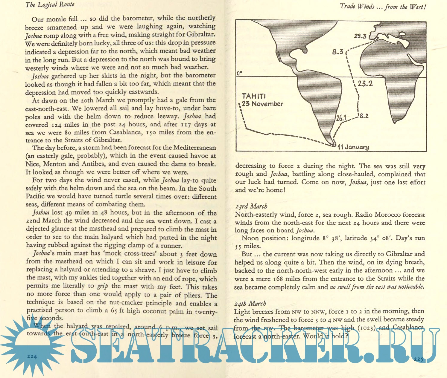 Description: This is the story of Bernard and Françoise Moitessier's honeymoon voyage aboard Joshua, sailing from Europe to the islands of the Pacific and back by way of Cape Horn, the "logical route," because it was the fastest. Setting out from Tahiti, they make their way through the Roaring Forties, iceberg territory, and the relentless gale-force winds of the higher latitudes. They owe their survival to careful preparation, superior seamanship, and their sens of harmony with Joshua and the sea.