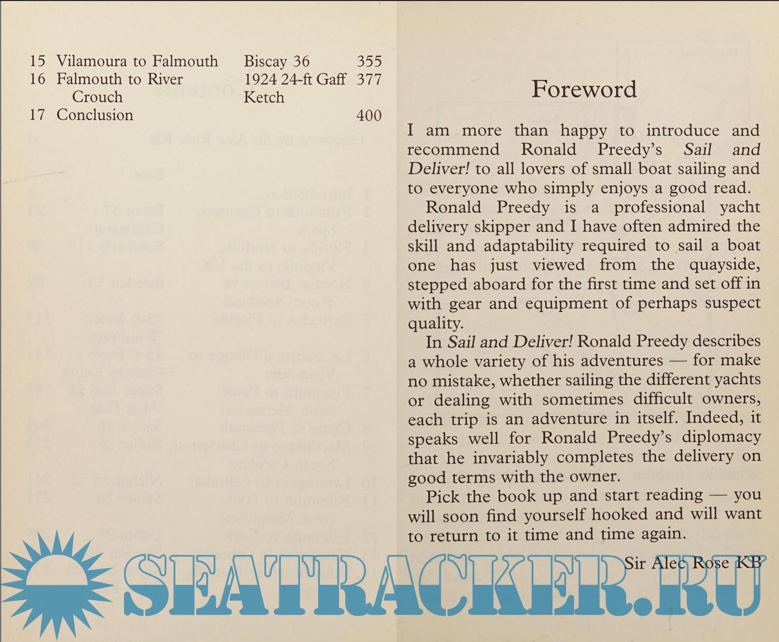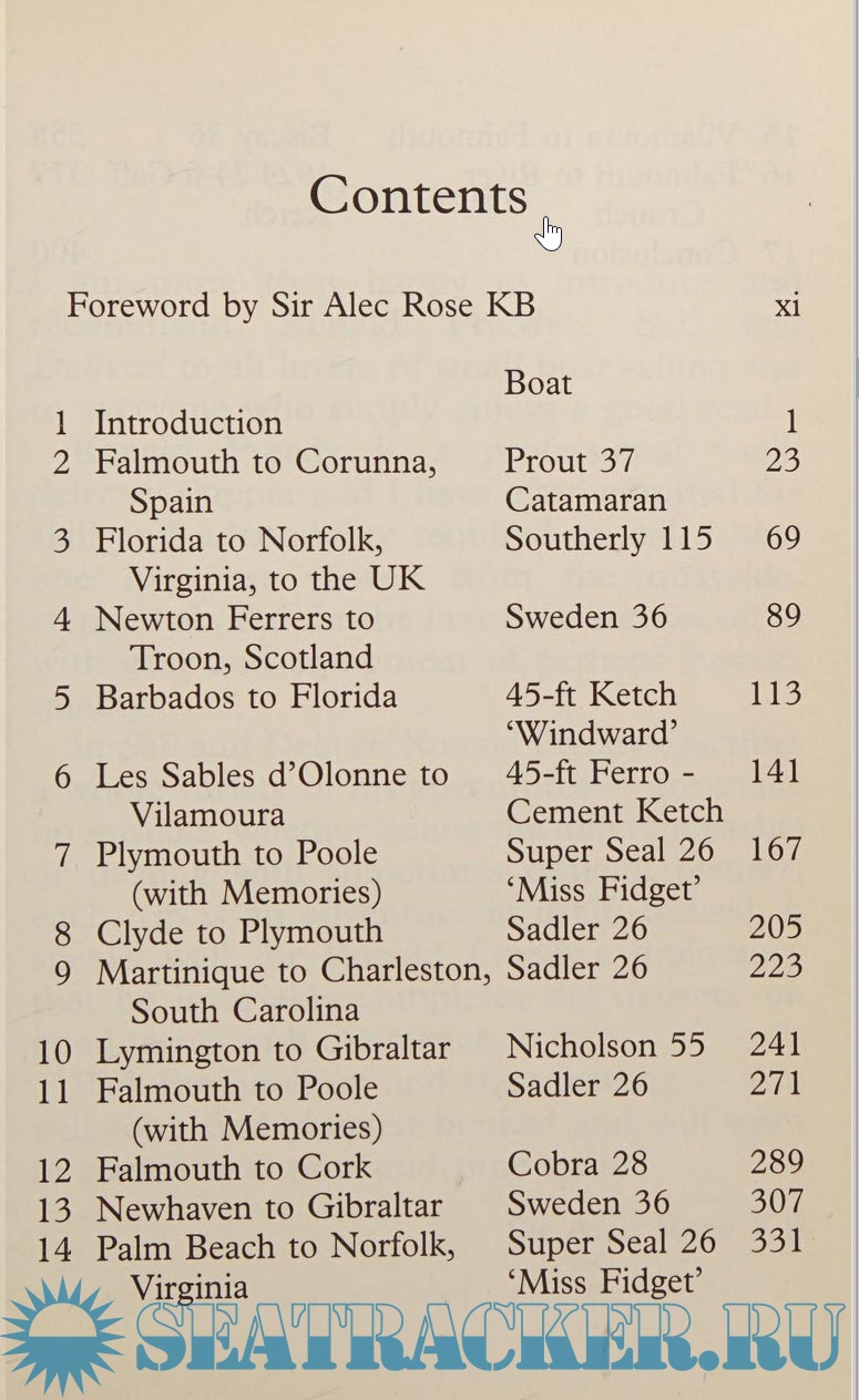 Year: 2004 Language: English Author: Ronald Preedy Genre: Textbook Publisher: ULVERSCROFT Edition: First ISBN: 1-184395-151-7 Format: PDF Quality: Scanned pages Pages count: 403 Description: Ronald Preedy sailed yachts for a living, delivering them to places as far apart as Scotland, Spain, Martinique and the USA. In this varied collection of sixteen stories, he recalls some of his most memorable journeys. These include his near-fatal encounter with the October 1987 hurricane, off the coast of Spain. He also gets a taste of the world of 'Miami Vice' when, on a trip from Barbados to Florida, his boat is searched by fully armed Bahamian police officers who mistakenly suspect him of drug smuggling. But these dramatic incidents are off-set by many lighter ones, often caused by the yachts' owners themselves.