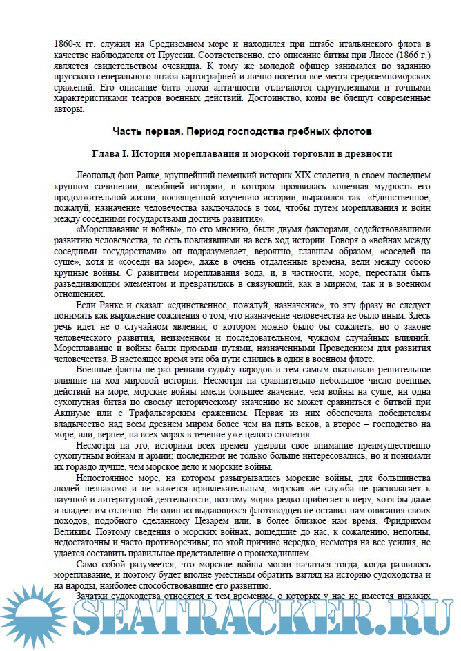 Содержание Том I К читателю Часть первая. Период господства гребных флотов Глава I. История мореплавания и морской торговли в древности [7] Глава II. Морское могущество Афин [75] Глава III. Карфаген и Рим [230] Глава IV. Господство Рима на Средиземном море [322] Глава V. Битва при Акциуме. Агриппа как морской вождь [335] Глава VI. Средиземное море. Соперничество гребных флотов [375] Часть вторая. Появление парусных военных флотов Глава I. Период перехода к парусному флоту [423] Глава II. Балтийское море и Ганзейский морской союз [477] Глава III. Эпоха Великой Армады [521] Глава IV. События в Западной Европе 1600-1650 гг. [554] Глава V. Первая англо-голландская война 1652-1654 гг. [580] Глава VI. Войны морских держав до 1665 г. [639] Том II К читателю Часть третья. Эпоха линейной тактики парусного флота Глава I. Вторая англо-голландская война 1665-1667 гг. [7] Глава II. Третья англо-голландская война 1672-1674 гг. [51] Глава III. Война Франции с Голландией и Испанией 1674-1678 гг. [96] Глава IV. Шведско-датская война 1675-1679 гг. [128] Глава V. Орлеанская война 1688-1697 гг. [178] Глава VI. Война за испанское наследство 1702-1713 гг. [228] Глава VII. Великая Северная война 1700-1721 гг. [272] Глава VIII. Исторический обзор морских войн 1715-1755 гг. [327] Глава IX. Семилетняя война 1756-1763 гг. [348] Глава X. Войны России и Турции 1768-1792 гг. [382] Глава XI. Морская политика Фридриха Великого и Екатерины II [399] Глава XII. Шведско-русская война 1788-1790 гг. [409] Послесловие к части третьей [476] Часть четвертая. Эпоха пара и брони Глава I. Крымская война 1854-1856 гг. [479] Глава II. Гражданская война в Соединенных Штатах Америки 1861-1865 гг. [527] Глава III. Прусско-датская война 1864 г. [621] Глава IV. Австро-итальянская война 1866 г. [631] Глава V. Военно-морская история 1856-1900 гг. [652] Глава VI. Война Франции с Китаем 1883-1886 гг. [677] Глава VII. Японо-китайская война 1894-1895 гг. [694] Глава VIII. Испано-американская война 1898 г. [728]