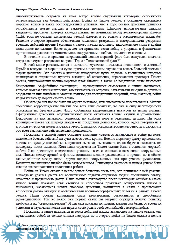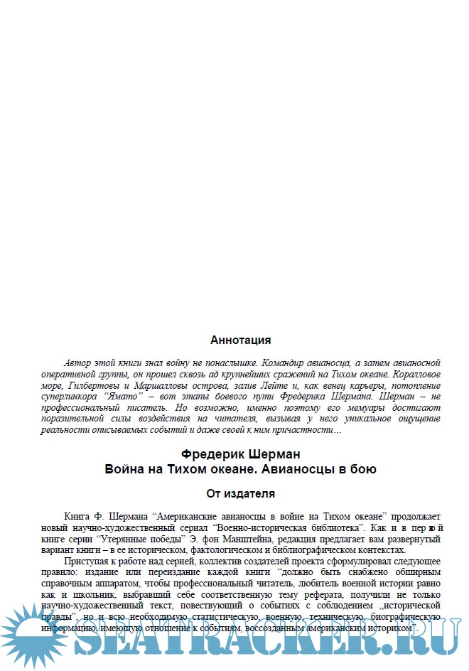 Описание: Автор этой книги знал войну не понаслышке. Командир авианосца, а затем авианосной оперативной группы, он прошел сквозь ад крупнейших сражений на Тихом океане. Коралловое море, Гилбертовы и Маршалловы острова, залив Лейте и, как венец карьеры, потопление суперлинкора «Ямато» — вот этапы боевого пути Фредерика Шермана. Шерман — не профессиональный писатель. Но возможно, именно поэтому его мемуары достигают поразительной силы воздействия на читателя, вызывая у него уникальное ощущение реальности описываемых событий и даже своей к ним причастности...