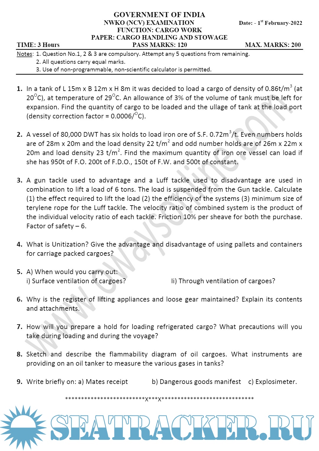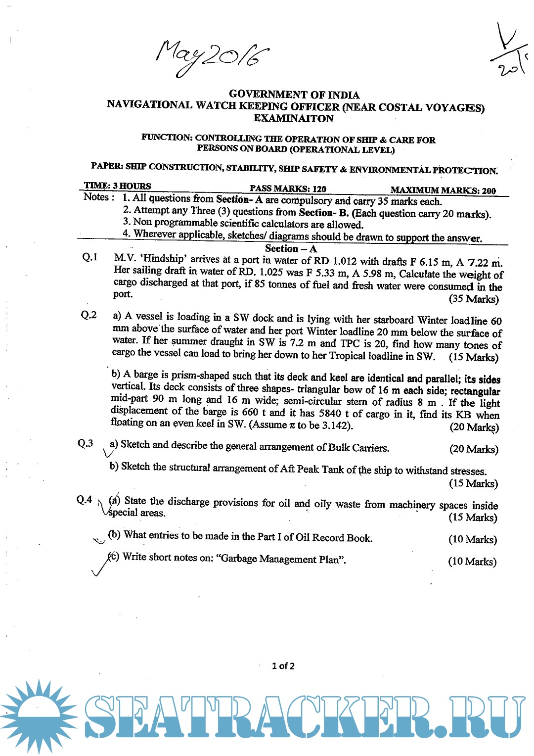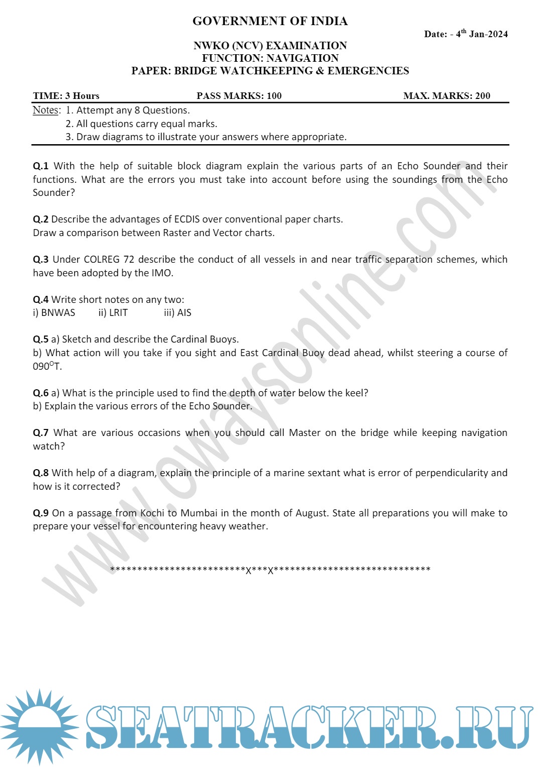Description: Question paper sets for Officer In Charge of a Navigational Watch (Near Coastal Voyages) | (NWKO NCV)Mercantile Marine Department (MMD), India Examinations.