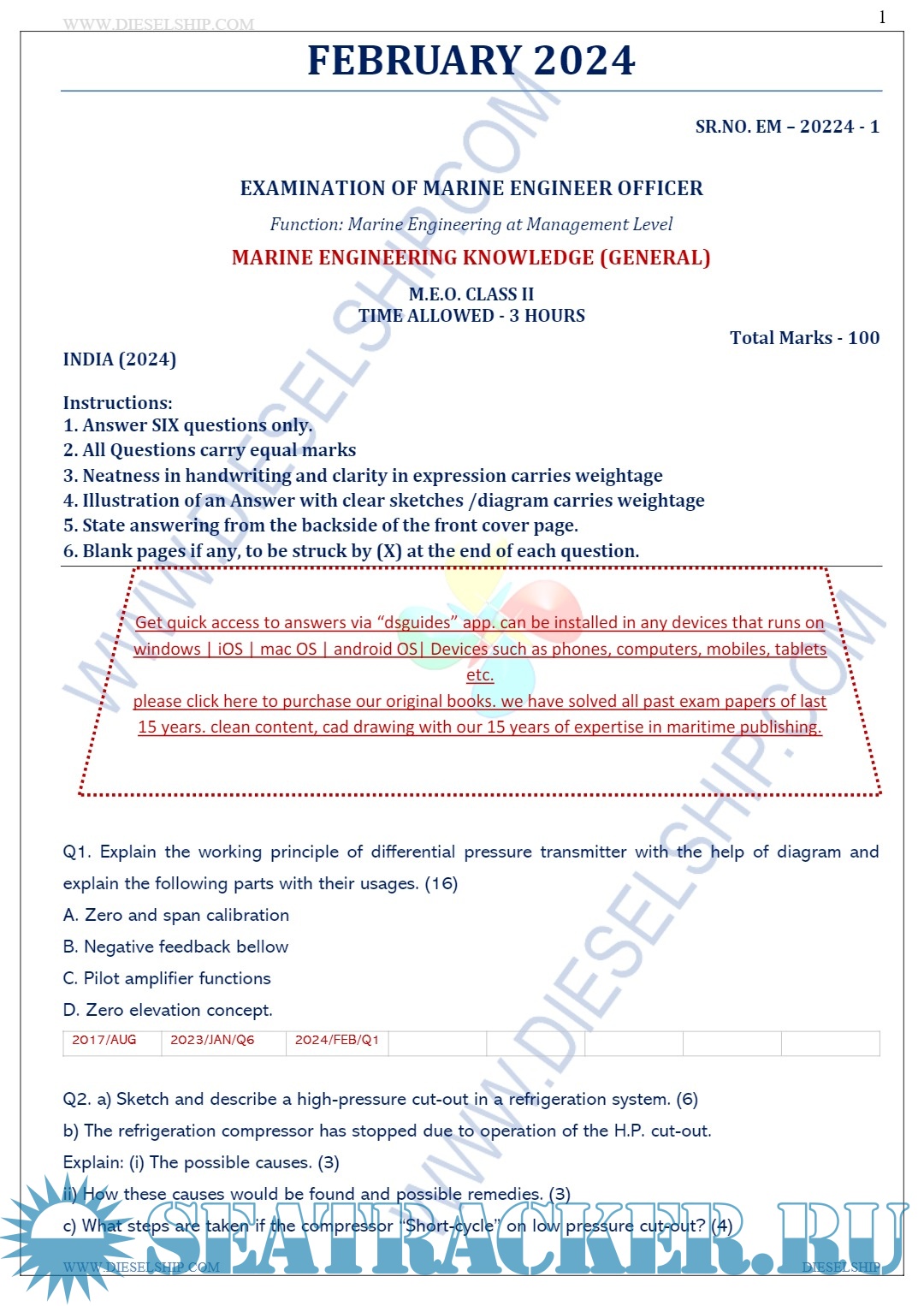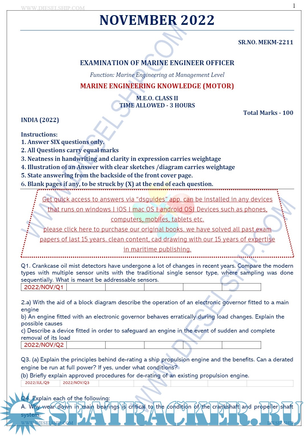 Description: M.E.O. Class II Question Paper set for Mercantile Marine Department (MMD), D.G. Shipping India Exams.