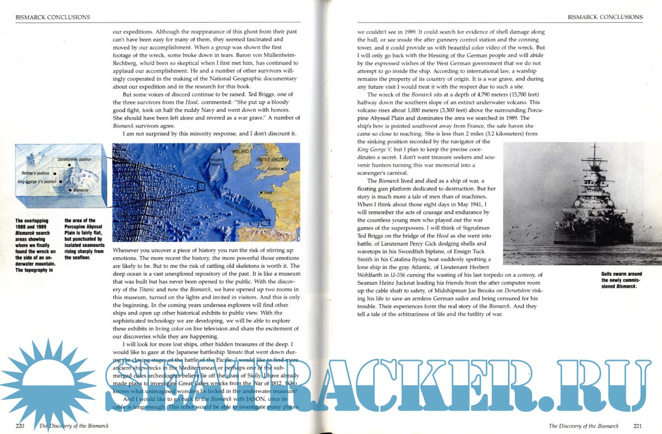 Year: 1990 Language: english Author: Robert D. Ballard Genre: History Publisher: Madison Press Books ISBN: 978-0340529768 Format: PDF Quality: Scanned pages Pages count: 121 Description: Using a new system of underwater exploration technology, the author and his team have located the Bismarck off the Atlantic coast of France. In a first person account of his work, the author recounts the history of the German warship. The author's previous books include "Exploring the Titanic". Additional info: Germany's greatest battleship surrenders her secrets.