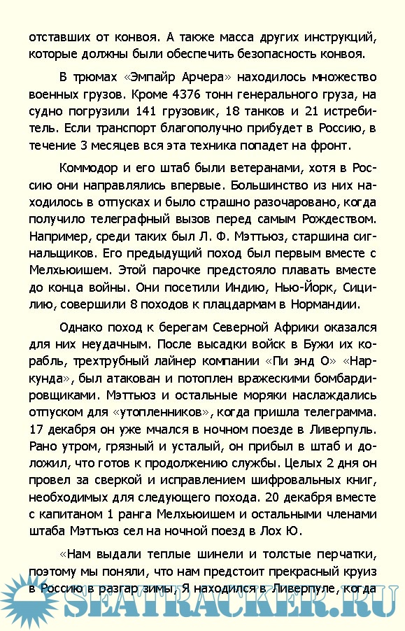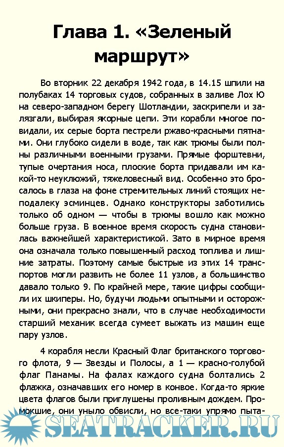 Содержание Глава 1. «Зеленый маршрут» [14] Глава 2. Главнокомандующий [26] Глава 3. «Поле судьбы» [39] Глава 4. Вопреки поражениям [50] Глава 5. Проблема [63] Глава 6. Беспокойное время [68] Глава 7. «Лично командиру» [81] Глава 8. Сочельник, 1942 год [96] Глава 9. Якорь панер [103] Глава 10. Гонка начинается [116] Глава 11. Большие кучи металлолома [135] Глава 12. Действовать осторожно [150] Глава 13. Боевая тревога [156] Глава 14. «Хиппер» атакует [172] Глава 15. «Онслоу» поврежден [188] Глава 16. Последняя радиограмма [205] Глава 17. Появляется «Лютцов» [213] Глава 18. Пли... Пли... Пли...! [227] Глава 19. Появляется «Лютцов» [249] Глава 20. «Акейтес» сражается за жизнь [261] Глава 21. Жены ждут [276] Глава 22. Томительная ночь [283] Глава 23. Шербрук, кавалер Креста Виктории [303] Глава 24. Бескровная победа [316] Глава 25. Жатва Гитлера [331] Приложения [335] Примечания Список иллюстраций