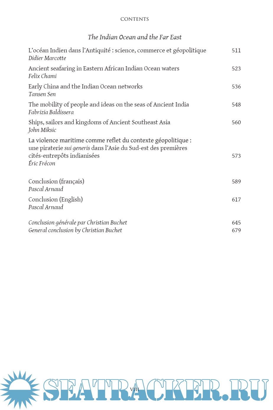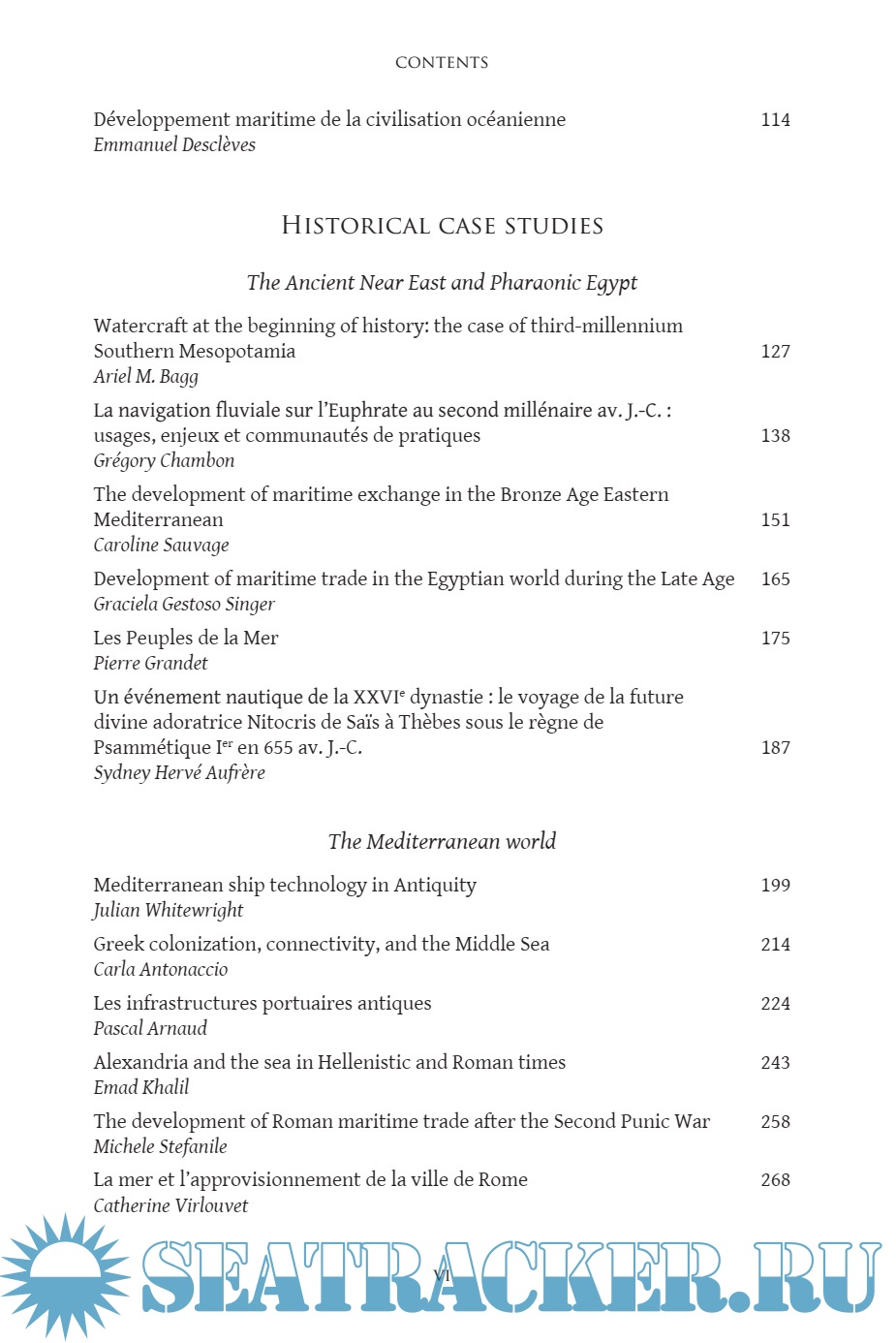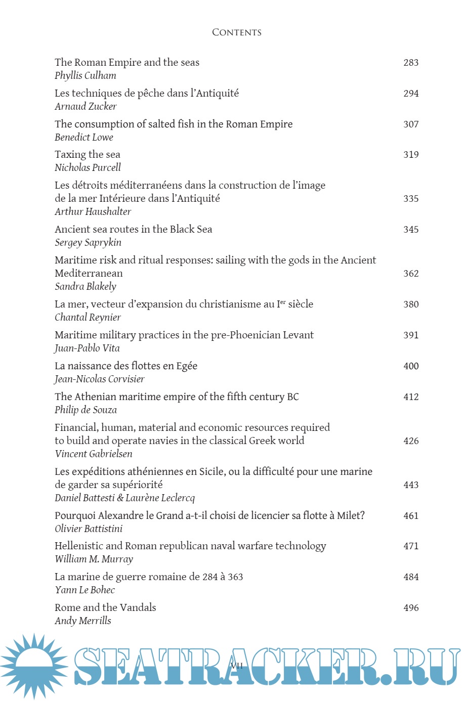 Table of Contents Introduction - Pascal Arnaud (Université Lyon 2, Institut Universitaire de France) La mer est le propre d'Homo sapiens - Pascal Picq (Collge de France, Paris) Maritime aspects of early Andean civilizations - Daniel Sandweiss (University of Maine) Une approche maritime et archipélique de l'occupation amérindienne des Antilles - Benot Bérard (Université des Antilles et de la Guyane) The Tano of the Caribbean: six thousand years of seafaring and cultural development - Richard T. Callaghan (University of Calgary) The importance of the sea for prehistoric societies in Western Europe - Barry Cunliffe (Oxford University) Pche et interactions entre la Moyenne Vallée du fleuve Sénégal et le littoral atlantique Sénégalo-Mauritanien durant le dernier millénaire BC - Alioune Dme (University Cheikh Anta Diop, Dakar) The sea and early societies in the Japanese islands - Mark J. Hudson (Mt Fuji World Heritage Centrefor Mountain Research and the Museum of Natural and Environmental History, Shizuoka) Développement maritime de la civilisation océanienne - Emmanuel Desclves (French Naval Academy) Watercraft at the beginning of history: the case of third-millennium Southern Mesopotamia - Ariel M. Bagg (Ruprech-Karls-Universität Heidelberg) La navigation fluviale sur l'Euphrate au second millénaire av. J.-C. : usages, enjeux et communautés de pratiques - Grégory Chambon (University of Western Brittany) The development of maritime exchange in the Bronze Age Eastern Mediterranean - Caroline Sauvage (Loyola Maramount University) Development of maritime trade in the Egyptian world during the Late Bronze Age - Graciela Gestoso Singer (Pontifical Catholic University of Argentina) Les Peuples de la Mer - Pierre Grandet (Institut Franais Khéops) Un événement nautique de la XXVIe dynastie : le voyage de la future divine adoratrice Nitocris de Sas Thbes sous le rgne de Psammétique Ier en 655 av. J.-C. - Sydney Hervé Aufrre (CNRS, University of Aix- Mediterranean ship technology in Antiquity - Julian Whitewright (University of Southampton) Greek colonization, connectivity, and the Middle Sea - Carla Antonaccio (Duke University) Les infrastructures portuaires antiques - Pascal Arnaud (Université Lyon 2, Institut Universitaire de France) Alexandria and the sea in Hellenistic and Roman times - Emad Khalil (Alexandria University) The development of Roman maritime trade after the Second Punic War - Michele Stefanile (Universit di Napoli) La mer et l'approvisionnement de la ville de Rome - Catherine Virlouvet (École Franaise de Rome) The Roman Empire and the seas - Phyllis Culham (US Naval Academy, Annapolis) Les techniques de pche dans l'Antiquité - Arnaud Zucker (University of Nice Sophia-Antipolis) The consumption of salted fish in the Roman Empire - Benedict Lowe (Maynooth University) Taxing the sea - Nicholas Purcell (University of Oxford) Les détroits méditerranéens dans la construction de l'image de la mer Intérieure dans l'Antiquité - Arthur Haushalter (Casa Velazquez, Madrid) Ancient sea routes in the Black Sea - Sergey Saprykin (Moscow State University) Maritime risk and ritual responses: sailing with the gods in the Ancient Mediterranean - Sandra Blakely (Emory University) La mer, vecteur d'expansion du christianisme au Ier sicle - Chantal Reynier (Facultés jésuites de Paris, Centre Svres) Maritime military practices in the pre-Phoenician Levant - Juan-Pablo Vita (Spanish National Research Council, Madrid) La naissance des flottes en Egée - Jean-Nicolas Corvisier (University of Artois) The Athenian maritime empire of fifth century BC - Philip de Souza (University College Dublin) Financial, human, material and economic resources required to build and operate navies in the classical Greek world - Vincent Gabrielsen (University of Copenhagen) Les expéditions athéniennes en Sicile, ou la difficulté pour une marine de garder sa supériorité - Daniel Battesti (University of Franche-Comté) & Laurne Leclercq (University of Franche-Comté) Pourquoi Alexandre le Grand a-t-il choisi de licencier sa flotte Milet? - Olivier Battistini (University of Corsica) Hellenistic and Roman republican naval warfare technology - William M. Murray (University of South Florida) La marine de guerre romaine de 284 363 - Yann Le Bohec (University Paris IV-Sorbonne) Rome and the Vandals - Andrew Merrills (University of Leicester) L'océan Indien dans l'Antiquité: science, commerce et géopolitique - Didier Marcotte (University of Rheims) Ancient seafaring in Eastern African Indian Ocean waters - Felix Chami (University of Dar es Salam) Early China and the Indian Ocean Networks - Tansen Sen (Baruch College, City University of New York) The mobility of people and ideas on the seas of Ancient India - Fabrizia Baldissera (Universit degli studi di Firenze) Ships, sailors and kingdoms of Ancient Southeast Asia - John Miksic (National University of Singapore) La violence maritime comme reflet du contexte géopolitique : une piraterie sui generis dans l'Asie du Sud-est des premires cités-entrepts indianisées - Eric Frécon (French École Navale) Conclusion - Pascal Arnaud (Université Lyon 2, Institut Universitaire de France)