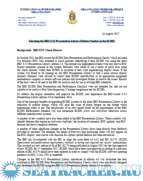 Year: 2017 Language: english Author: INTERNATIONAL HYDROGRAPHIC ORGANIZATION Genre: Other Publisher: INTERNATIONAL HYDROGRAPHIC ORGANIZATION Edition: 2017 Format: PDF Quality: OCR without errors Pages count: 4 Description: Checking the IHO S-52 Presentation Library Edition Number in the ECDIS
