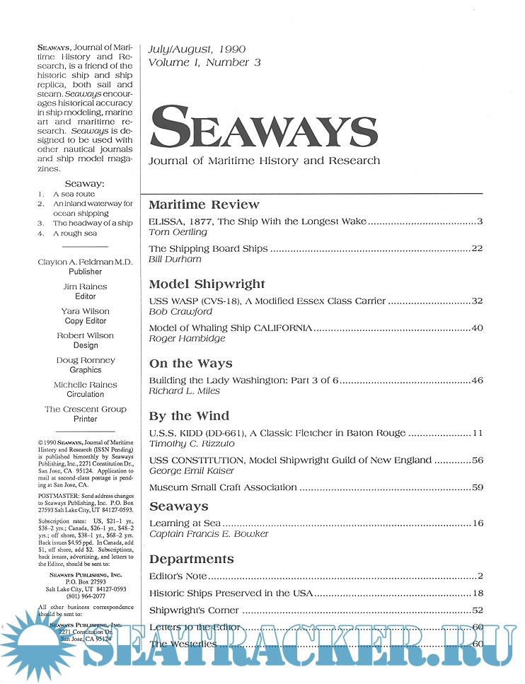 Year: 1990 Language: English Author: Scottie Dayton (Editor) Genre: Periodical (magazine) Edition: 1990-3 Format: JPEG Quality: Scanned pages Pages count: 74 Description: Seaway is the home port for Seaways Ships in Scale magazine, the leading workshop and research magazine for the ship modeler. In the magazine we explore all levels of modeling experience, all types of ships, all kinds of models, all historical eras and all construction materials