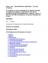 Year: 1964 Language: French Author: Tabarly É. Genre: History Publisher: ARTHAUD Format: PDF/EPUB Quality: eBook Pages count: 372 Description: Juin 1964, un enseigne de vaisseau encore inconnu perce la brume de Newport après une course transatlanlique en solitaire. Eric Tabarly vient de battre le favori, Francis Chichester, de soixante-sept heures et trente-cinq minutes. Victoire en solitaire est un récit capital, car il révèle Tabarly à l'aube de sa carrière et raconte ce qui fut l'une des plus grandes compétitions à voile de tous les temps. Pour gagner celle-ci, le jeune homme a créé un bateau sans égal, moderne et léger, qui révolutionne l'architecture navale : Pen Duick II. Cette année- là, un formidable navigateur entre dans la légende.